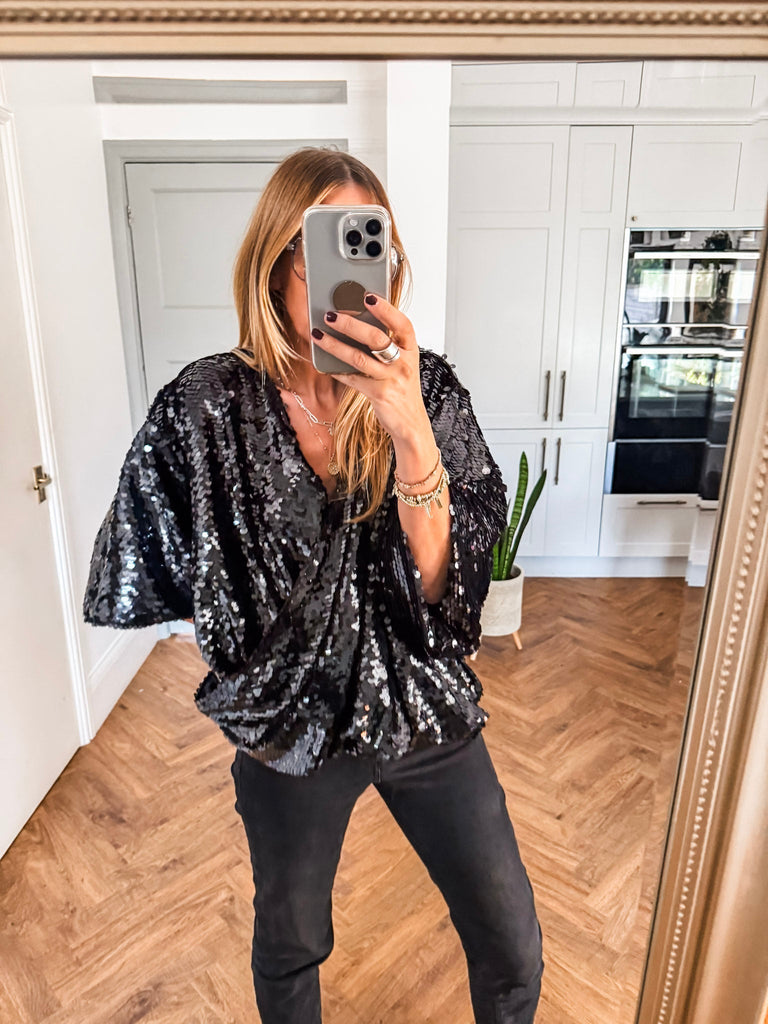 The black jacket tones down the sparkly sequins with the trainers keeping things casual for this daytime look. Then slip into some faux leather trousers for an elevated evening outfit.