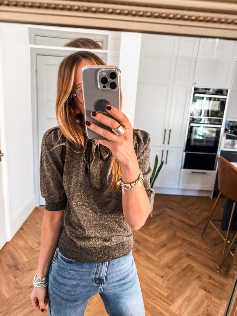 The tonal styling of the causal joggers and sequin cardigan elevates a daytime outfit. Into the evening you can’t go wrong with jeans and a nice top finished with some killer heels.