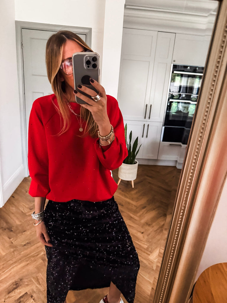 The combo of a sweatshirt, crossbody bag and runner trainers keeps this look cool and causal. Create a head-to-toe sequin look by pairing this skirt with the matching top.