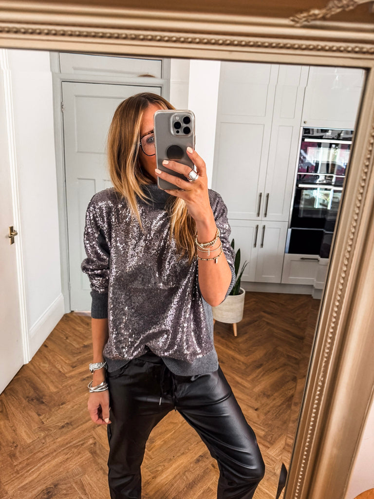 The black jacket tones down the sparkly sequins with the trainers keeping things casual for this daytime look. Then slip into some faux leather trousers for an elevated evening outfit.
