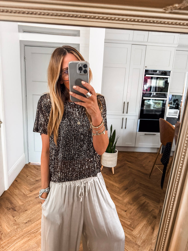 Start the day wearing these fabulous sequin trousers with a simple tee, oversized bomber jacket and trainers, before switching them for a fitted black top and pointed heeled boots.
