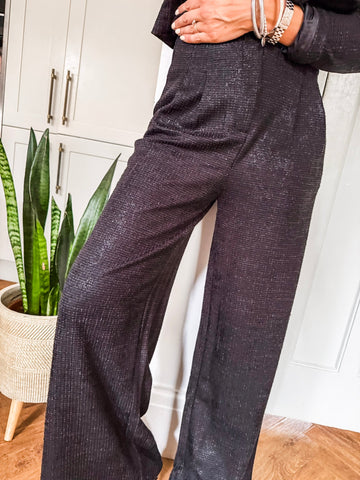 The ICHI Kate Gleam Wide Leg Pants add effortless polish with a subtle shimmer. Featuring a flattering darted front and flowing wide legs, they create a sleek, modern silhouette. Perfect for dressing up or down with understated elegance. Matching jacket available!