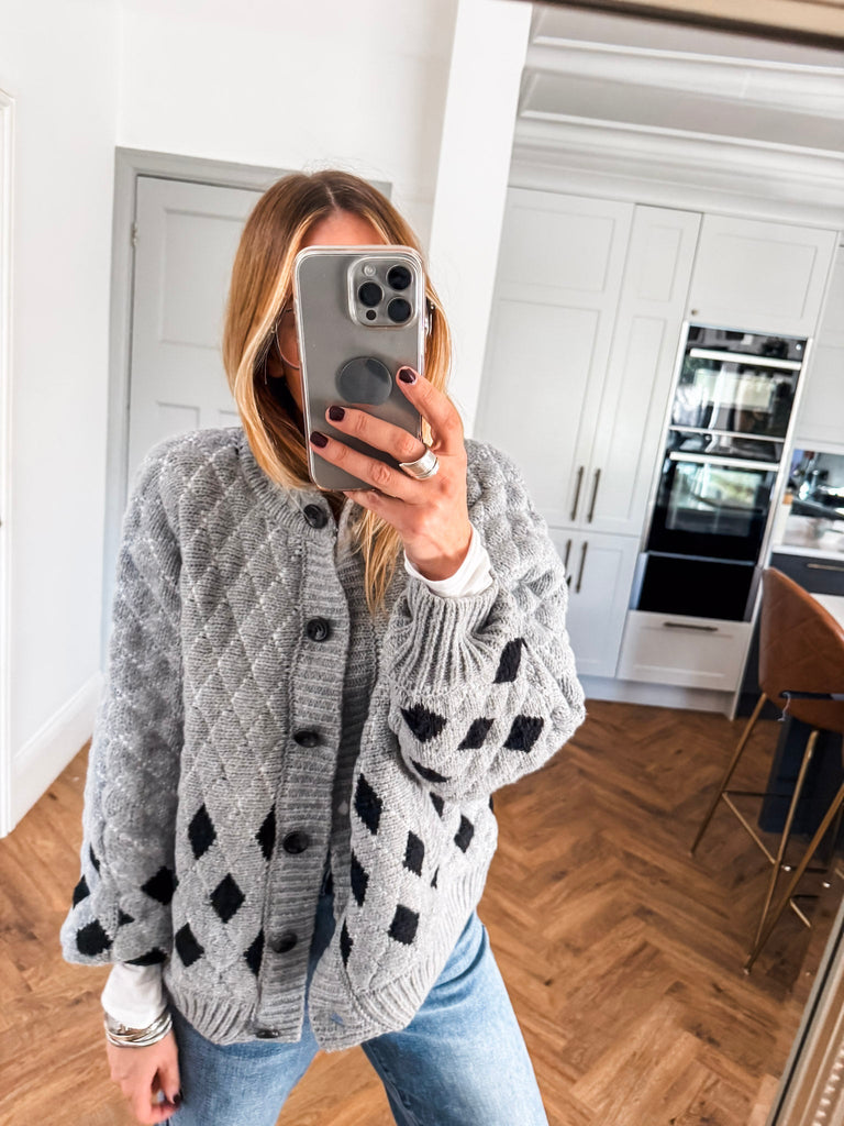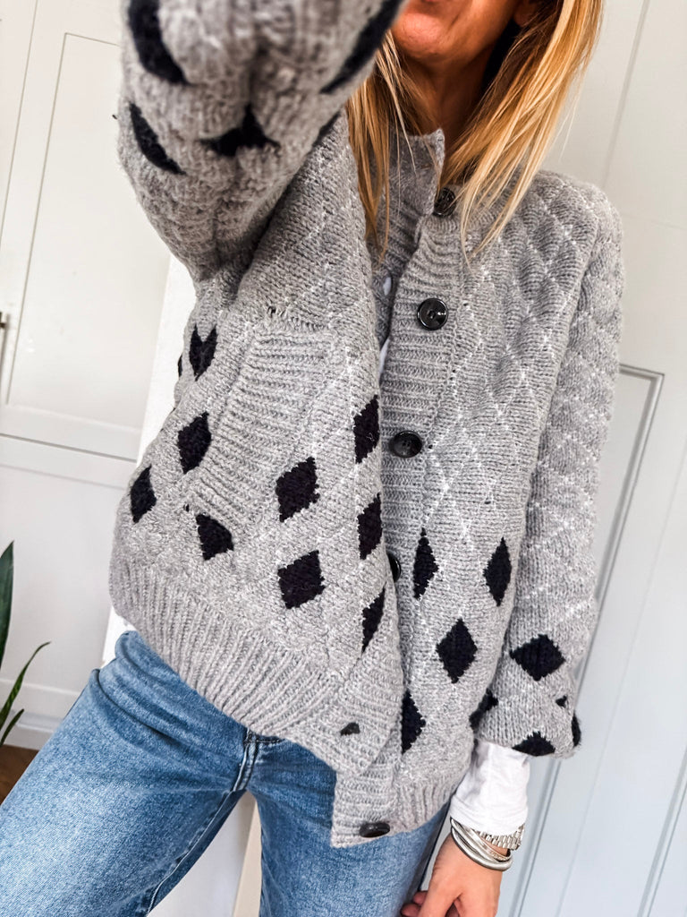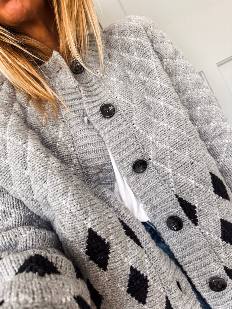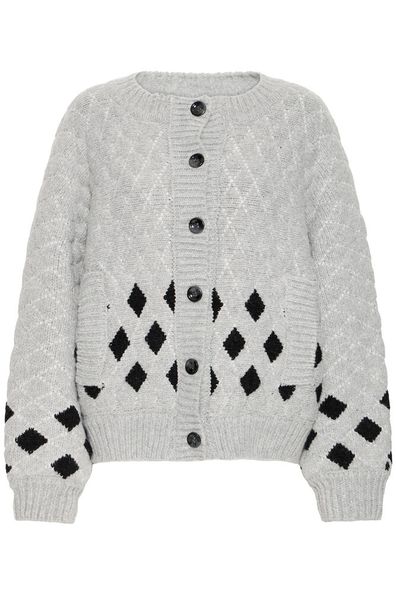 Beautiful chunky diamond knit. Stay effortlessly cozy with the ICHI Cortana Cardigan, crafted in a chunky knit for laid-back style and warmth. Featuring long sleeves, functional pockets, and a versatile button-up front, it’s made for easy layering. The perfect throw-on piece for cool, casual days.