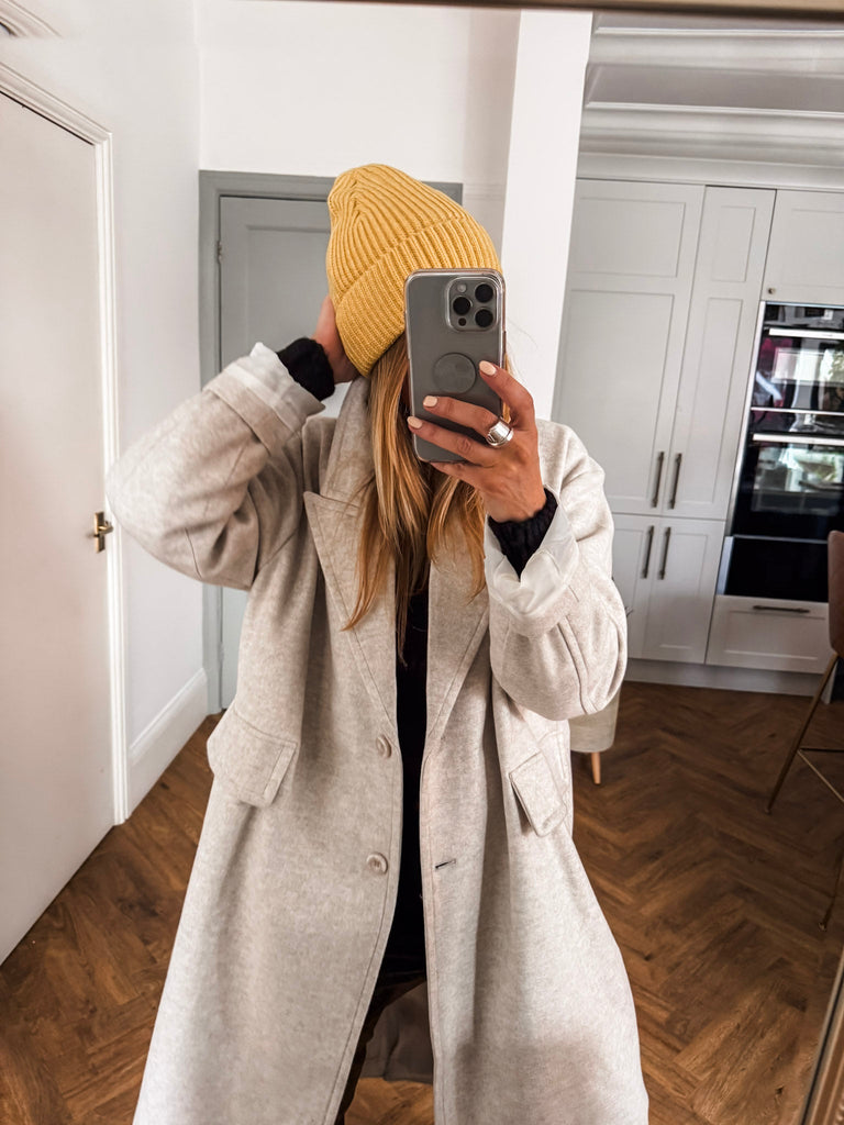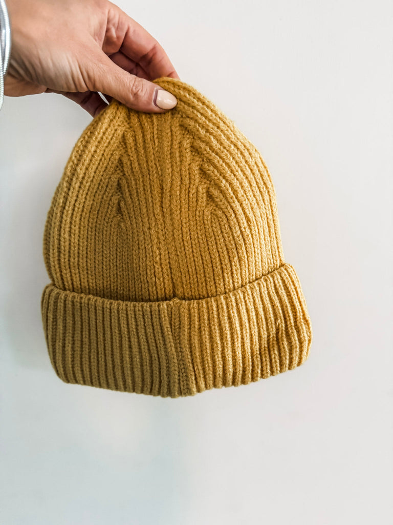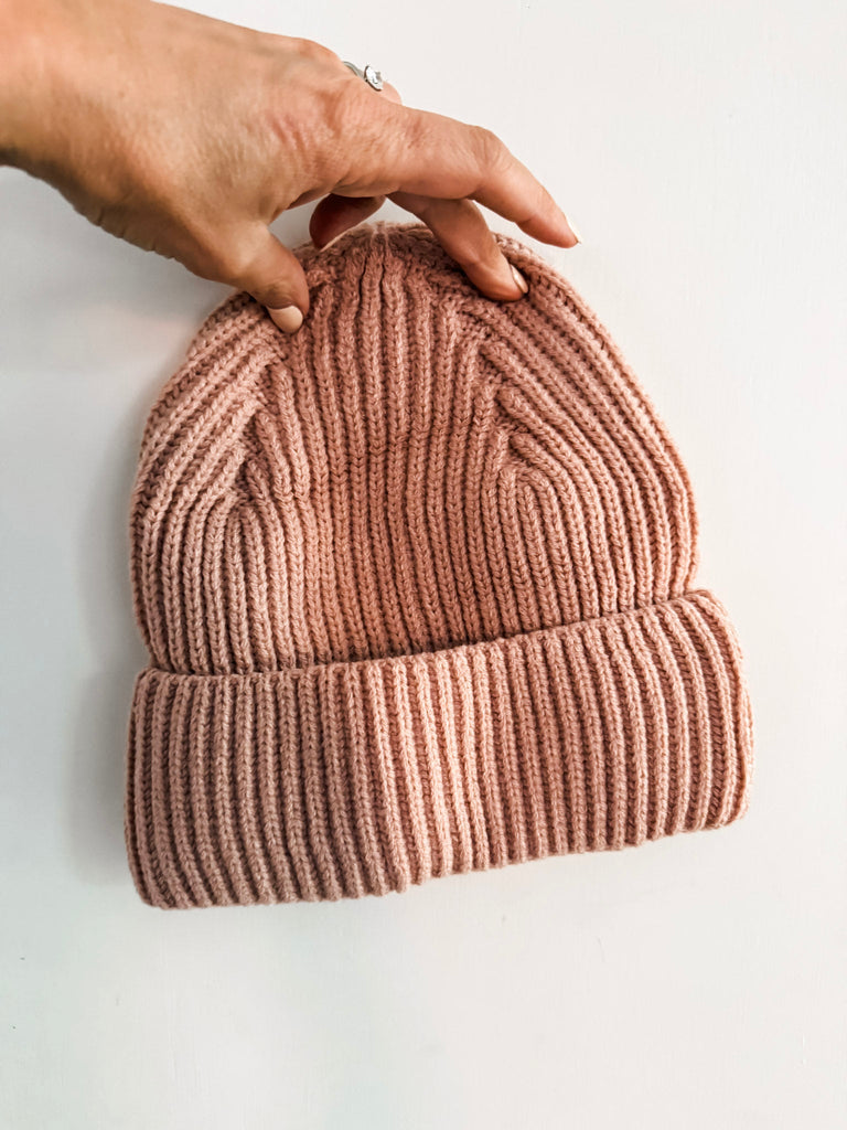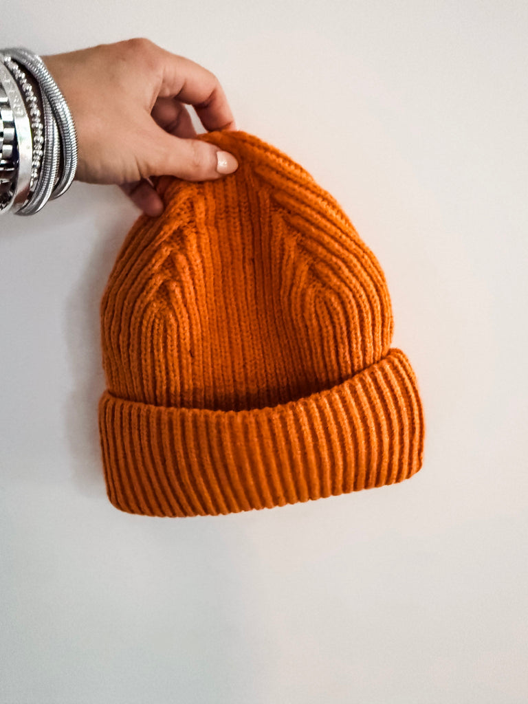 Beanie in a soft rib knit with a turn-up at the hem. Style this with one our coats this winter!