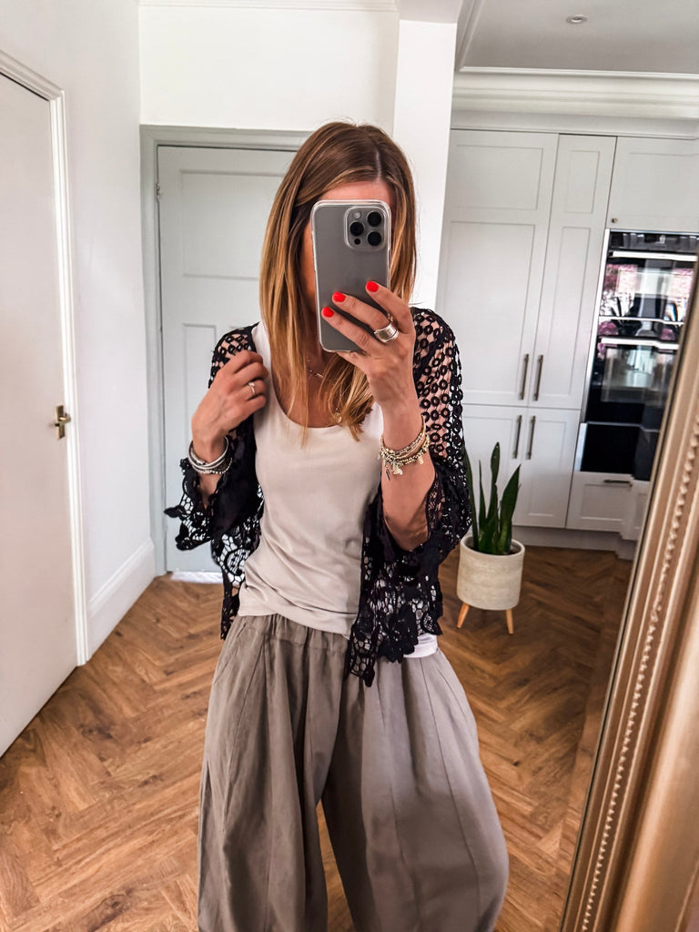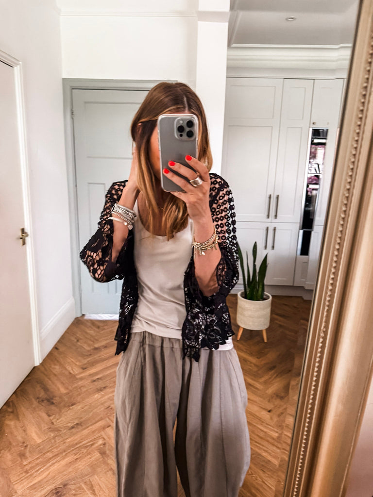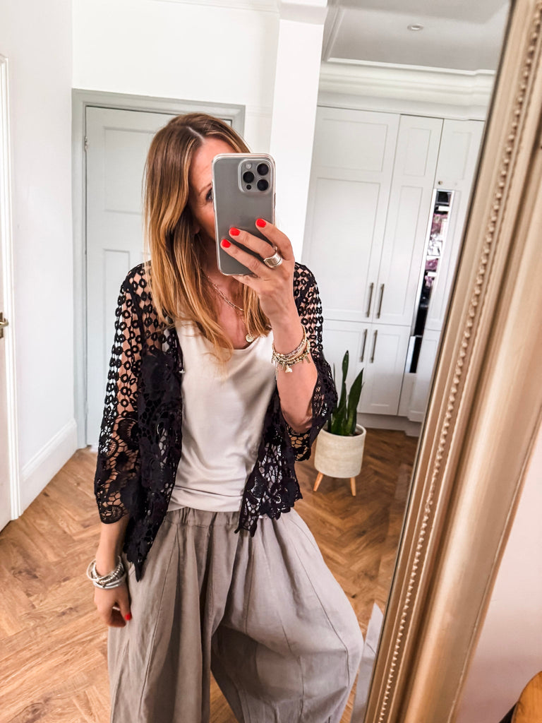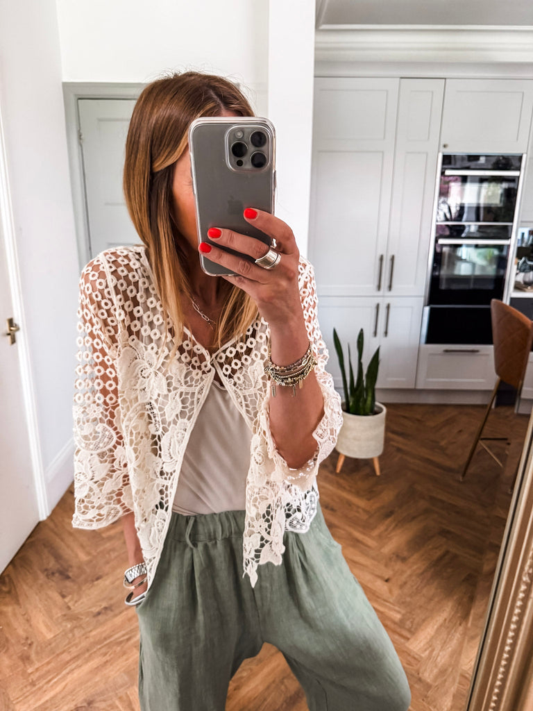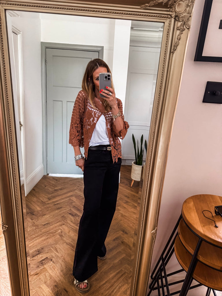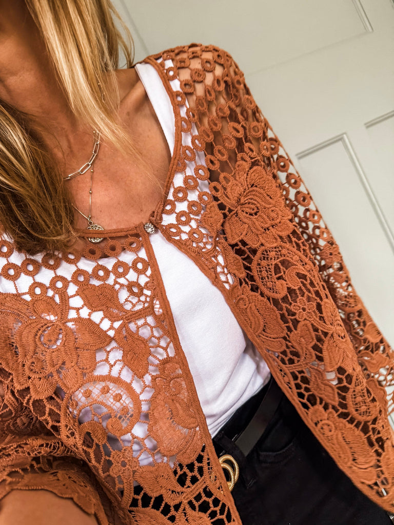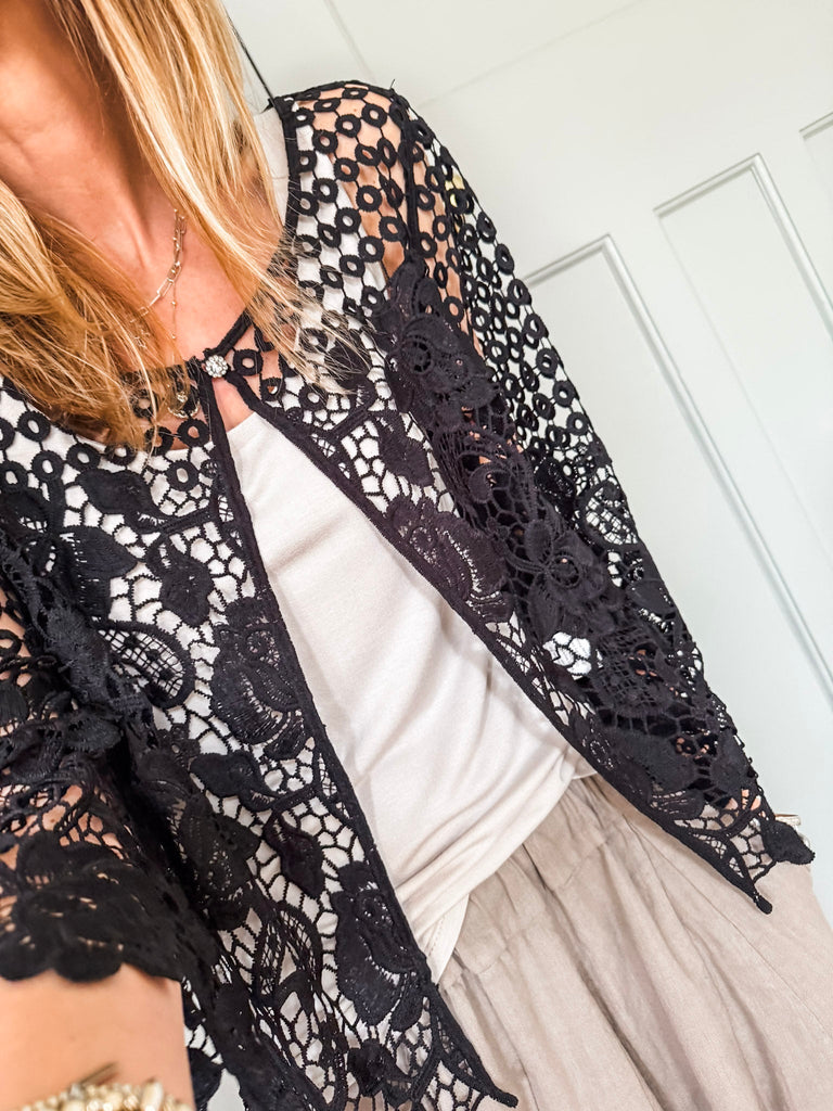 Our new lovely Crochet Shrug — where delicate lace meets effortless charm. Featuring 3/4 sleeves and a touch of sparkle from a rhinestone button, it’s the perfect layering piece for any occasion. Comfortable, versatile, and undeniably chic. Perfect for that added layer.
