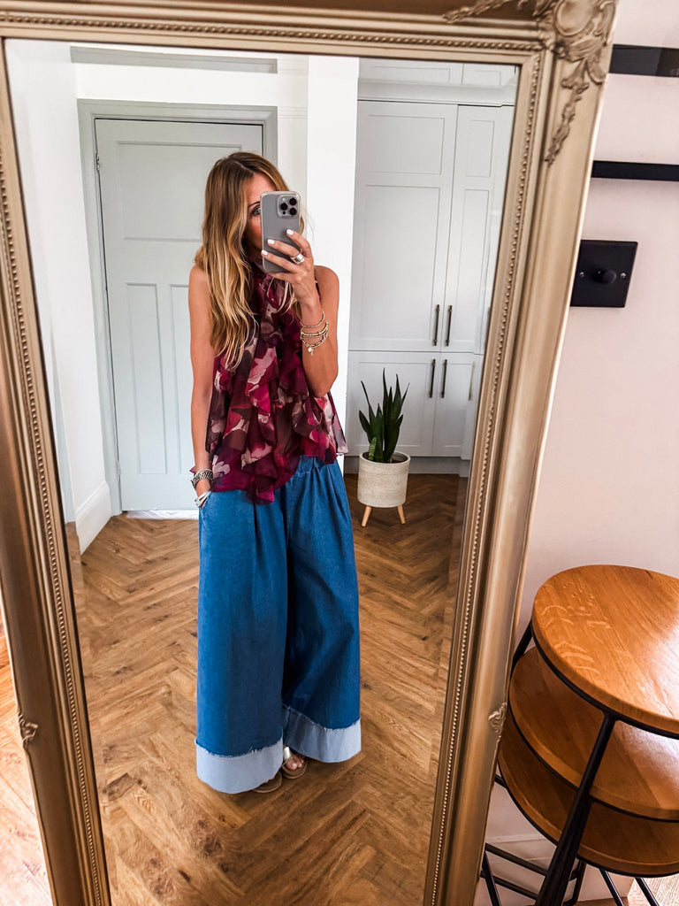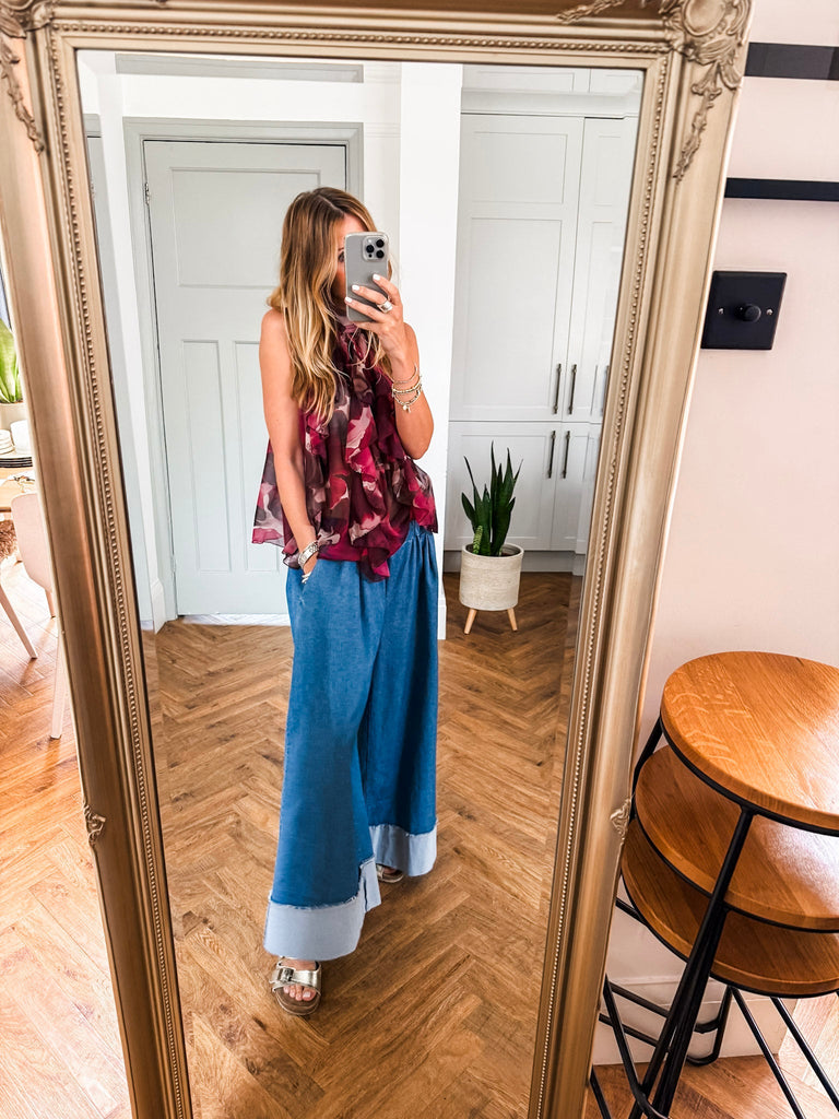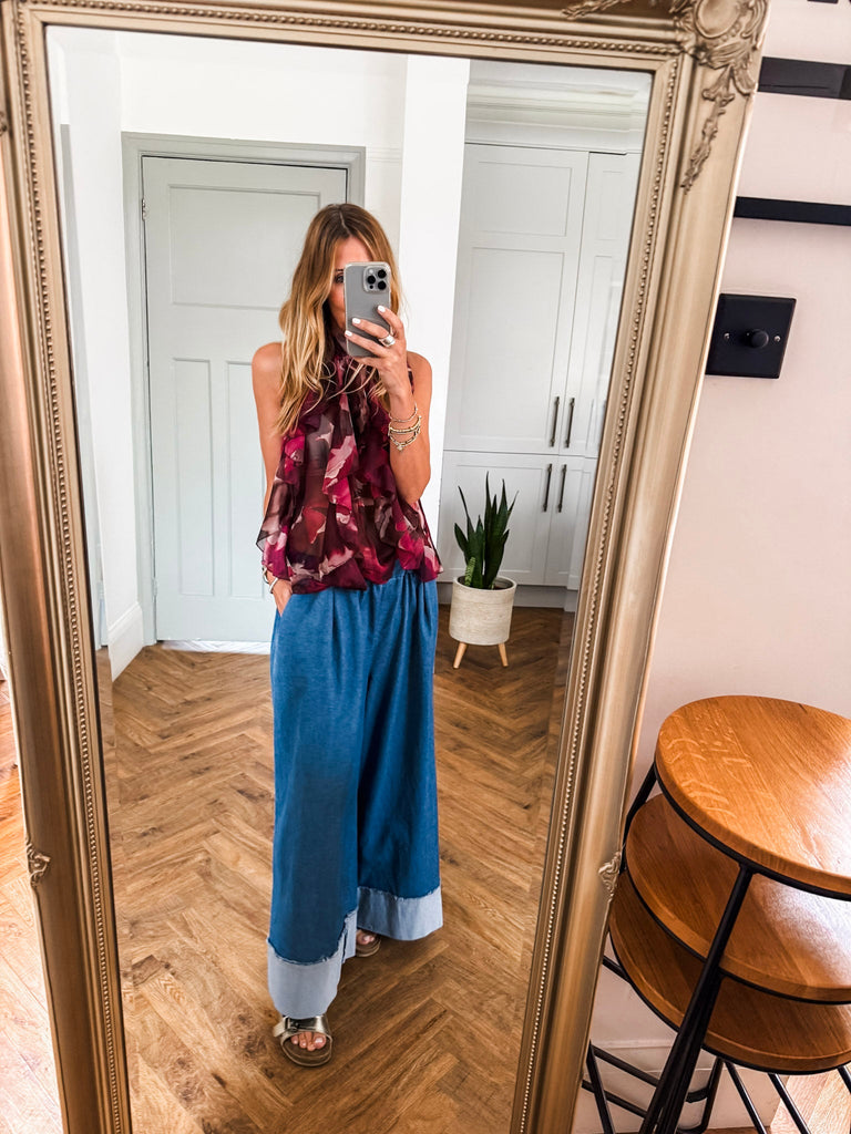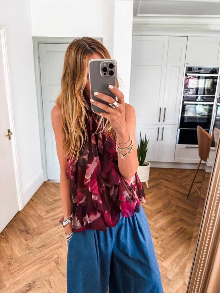 We love this top for its fresh, eye-catching print and flattering halter silhouette. The playful ruffles add just the right amount of movement and charm. It’s a statement piece that feels light, looks bold, and pairs effortlessly with your summer staples.