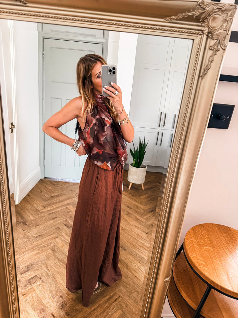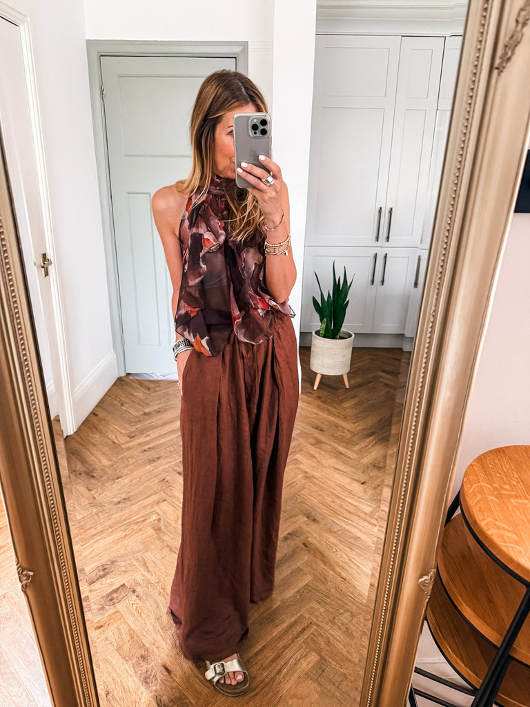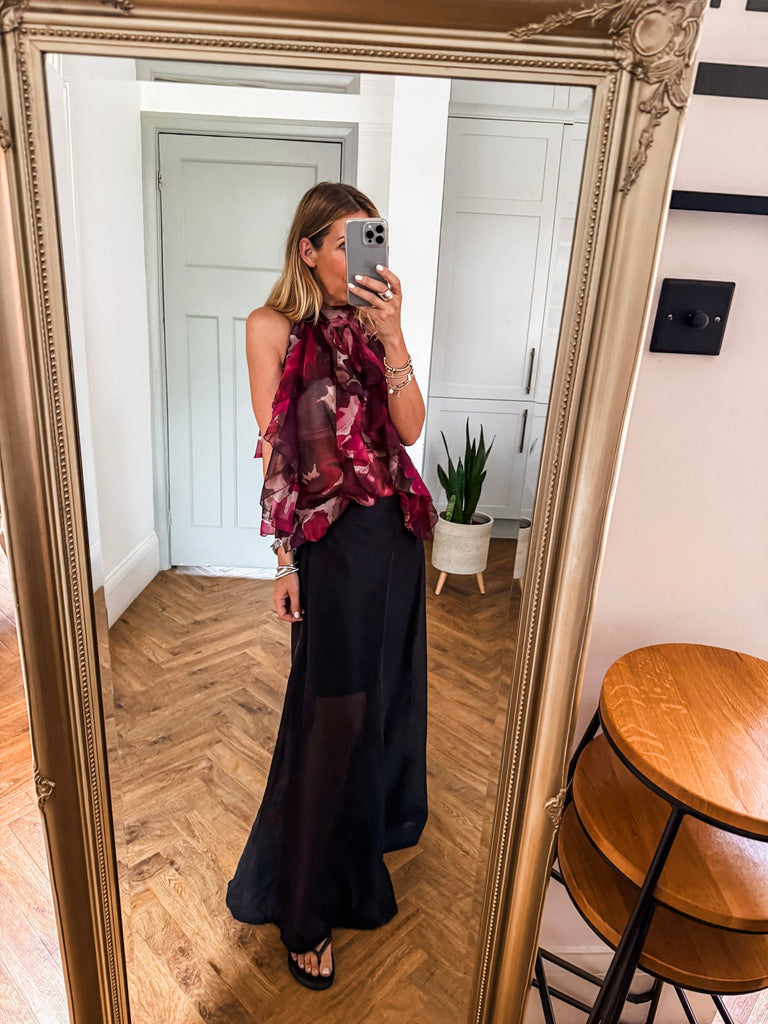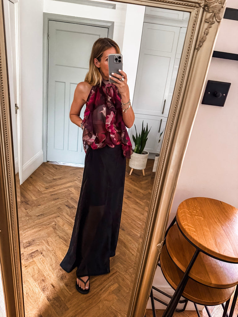 We love this top for its fresh, eye-catching print and flattering halter silhouette. The playful ruffles add just the right amount of movement and charm. It’s a statement piece that feels light, looks bold, and pairs effortlessly with your summer staples.