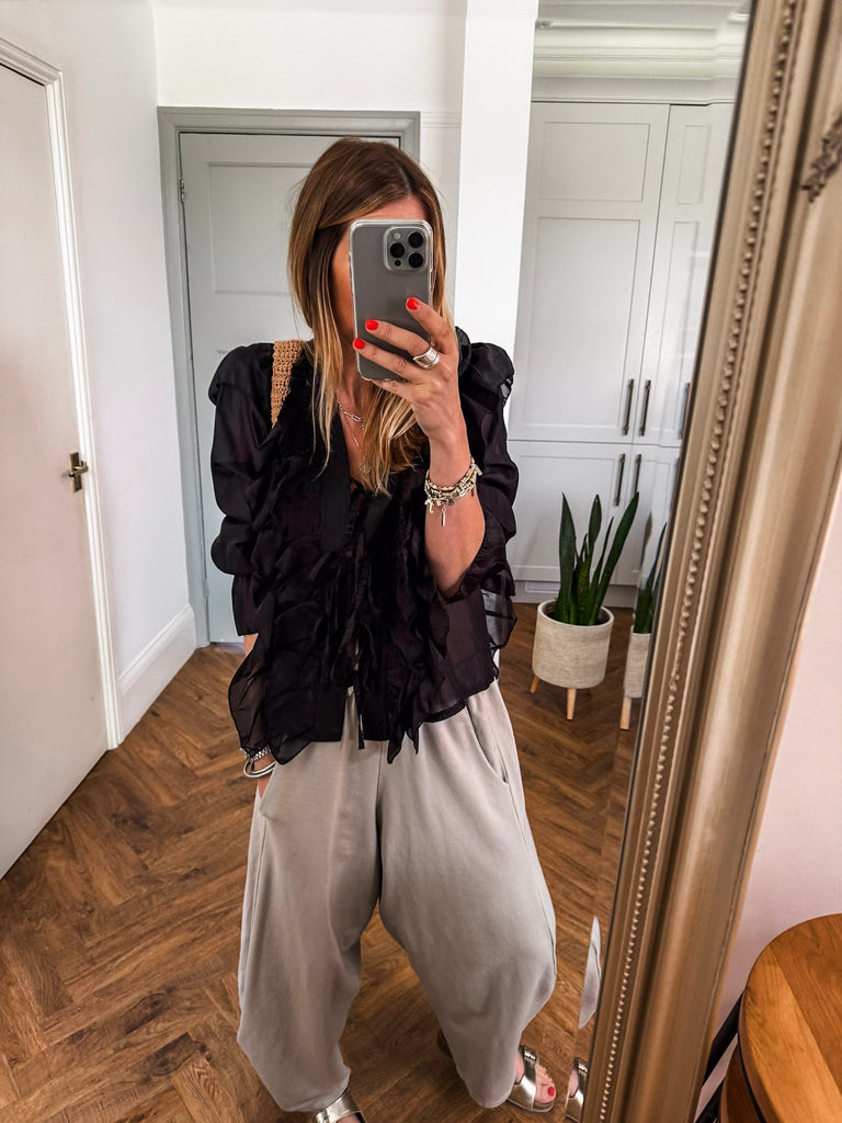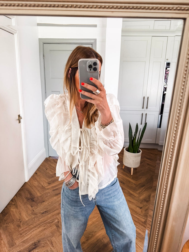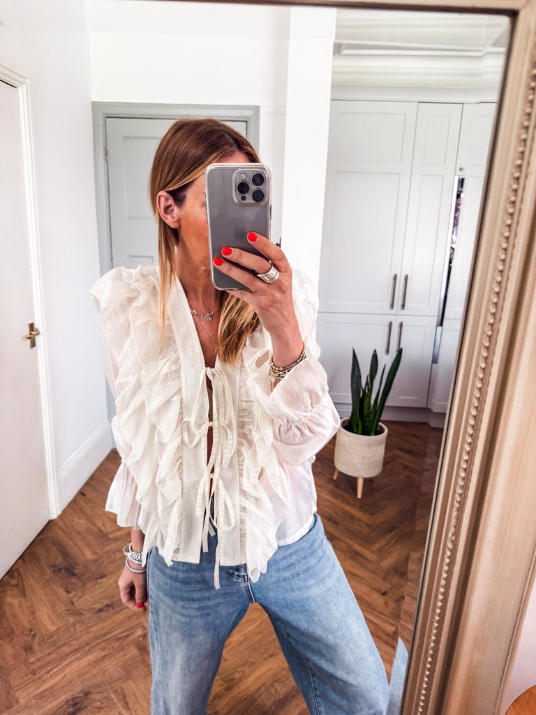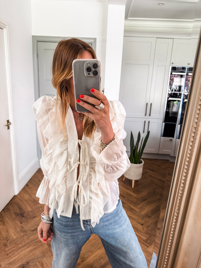 Perfect nice top to go with jeans! Playful twist to your look with the Tie Front Blouse—complete with frills, long sleeves, and a flattering fit. The tie detail brings a cool, feminine edge to this effortlessly chic piece. A versatile must-have that works from day to night.