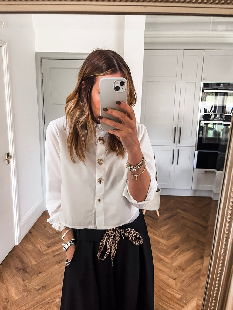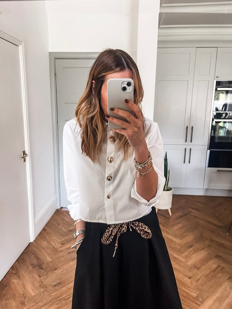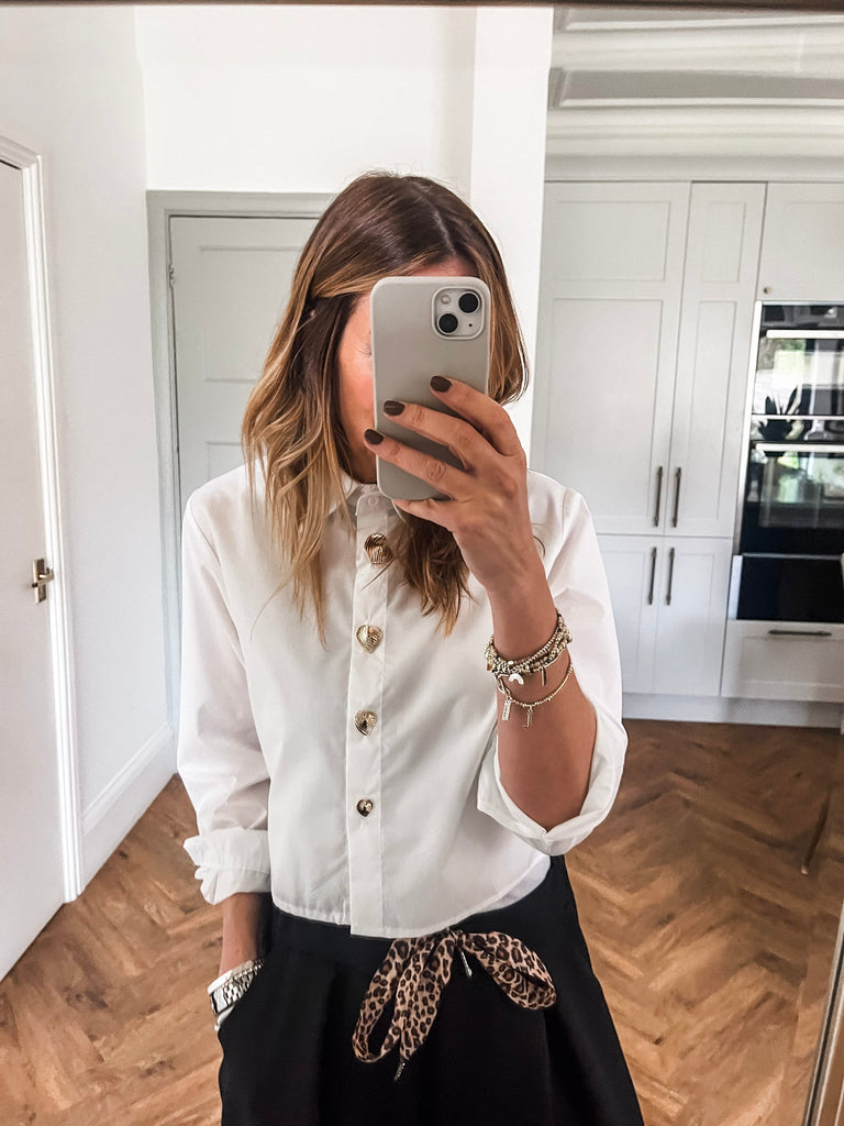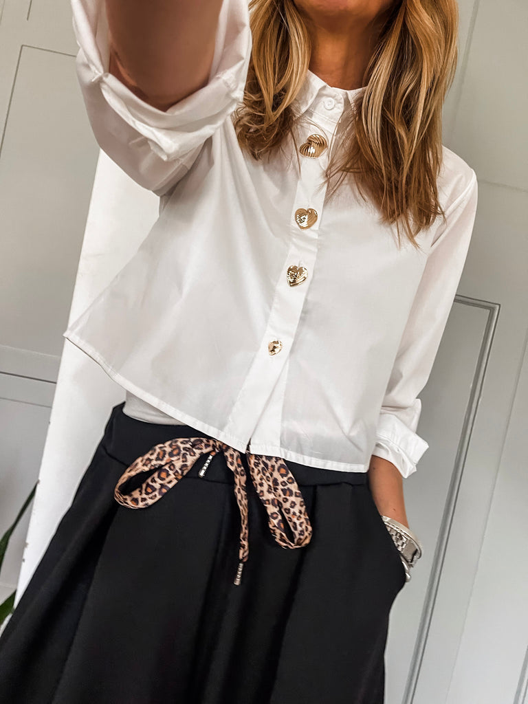 We love this cropped shirt for its perfect mix of playful charm and effortless style. The gold heart buttons add a unique, luxe touch, while the flattering fit makes it a go-to piece for any occasion. Versatile and on-trend, it’s designed for those who love fashion with a hint of romance.
