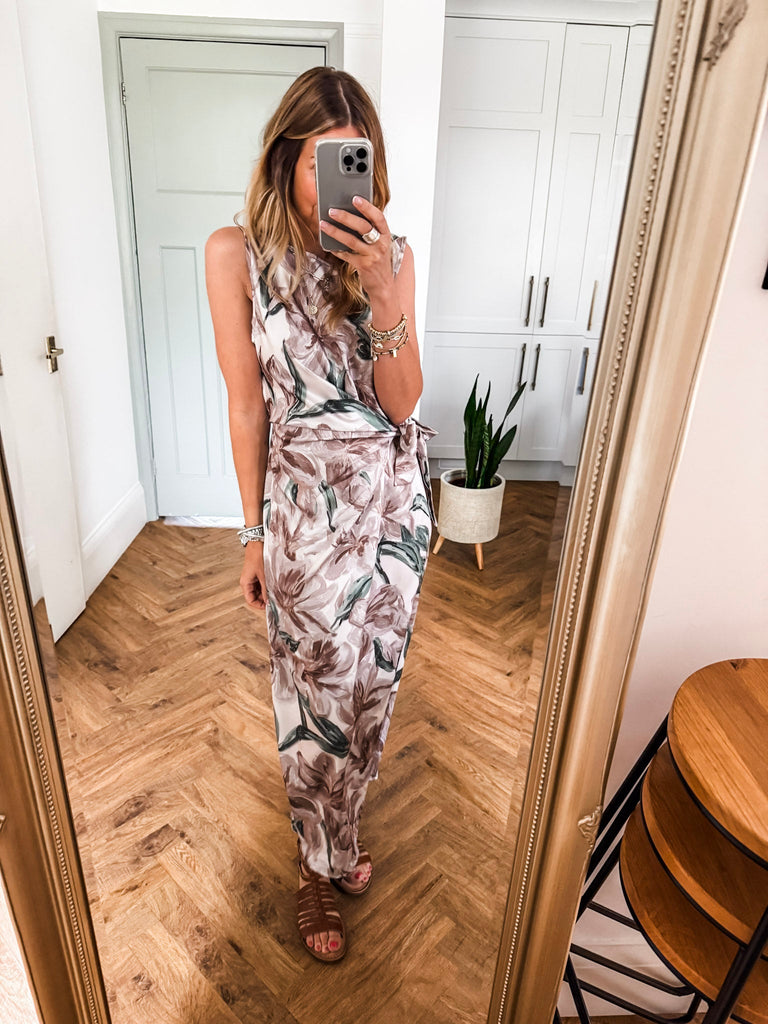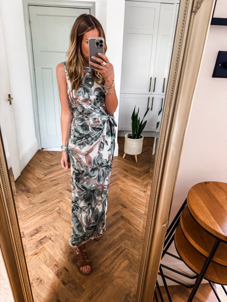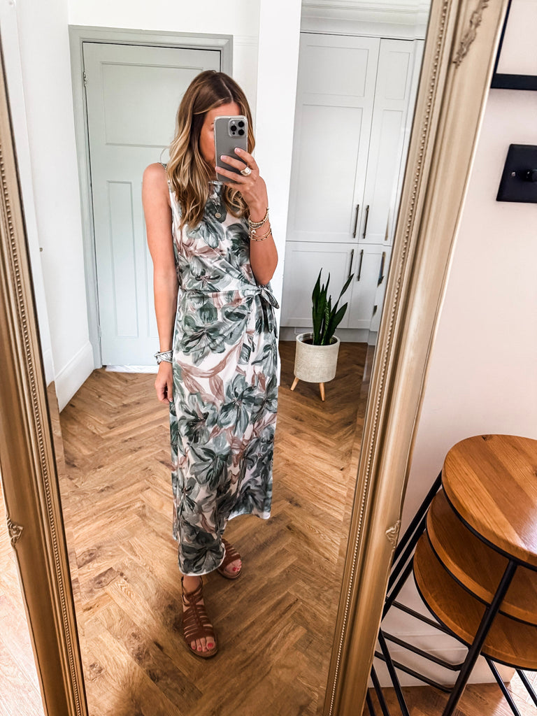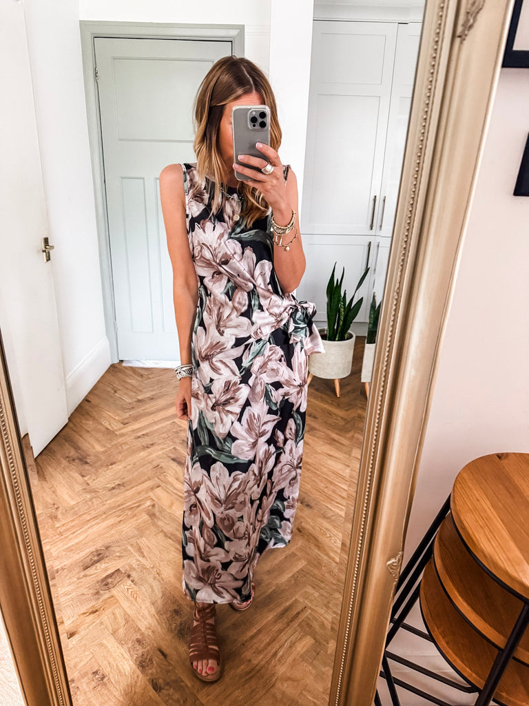 This sleeveless maxi dress dazzles with a chic tie-front and flattering round neckline. Its flowing silhouette and floral design offer effortless elegance for summer days. Perfect for warm-weather occasions and easy styling.