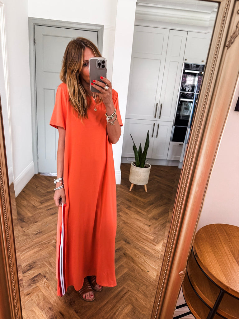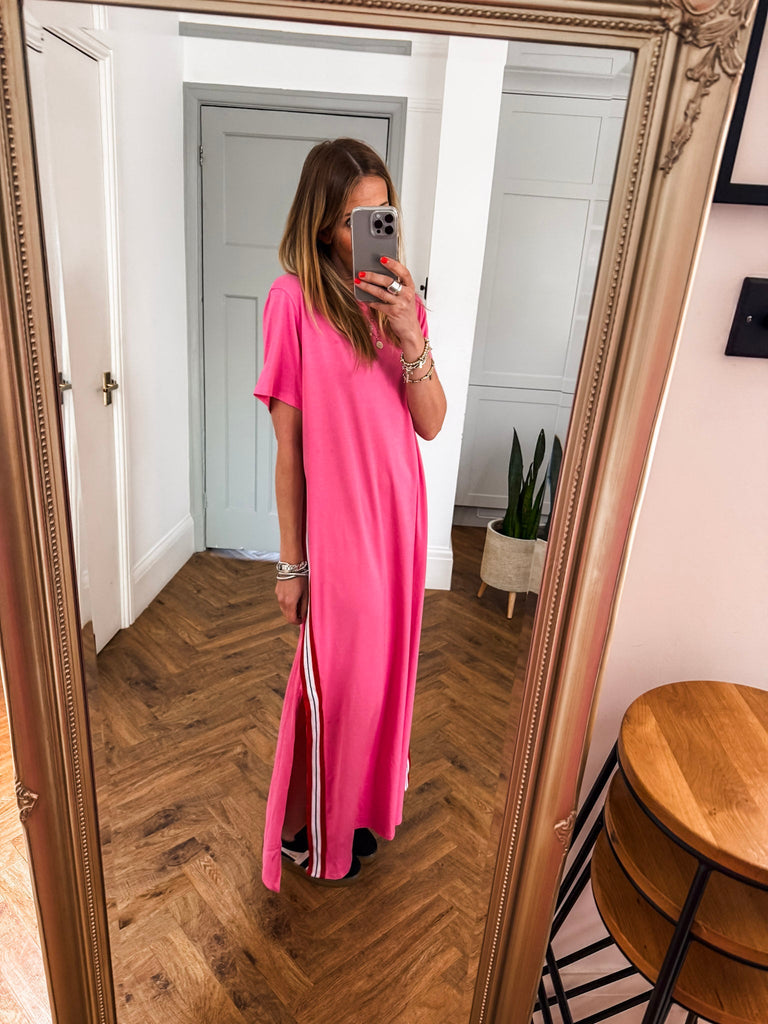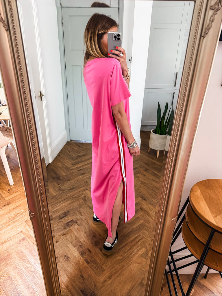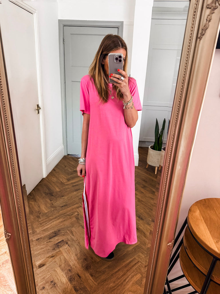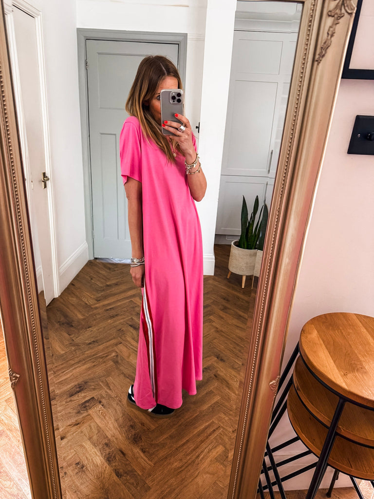 Step into effortless style with the Maxi Side Stripe Jersey Dress—casual, cool, and ultra-comfortable. The sleek side stripe adds a sporty edge, while the soft jersey fabric, short sleeves, and maxi length keep it laid-back yet refined. A versatile go-to for easy everyday dressing.