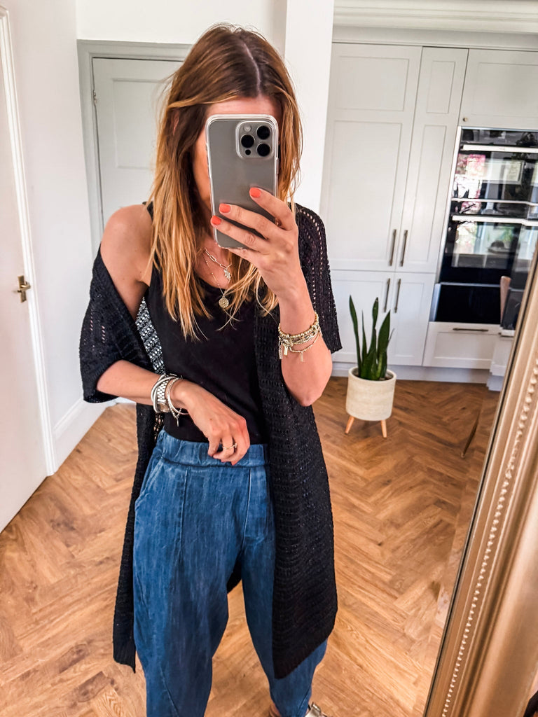 This is gorgeous over your bikini or vest & jeans! Add a touch of effortless glam with our Shimmer Long Cardigan. Designed with an open front and cropped sleeves, it layers beautifully over any look. The sleek length and subtle shimmer bring modern elegance to your everyday style.