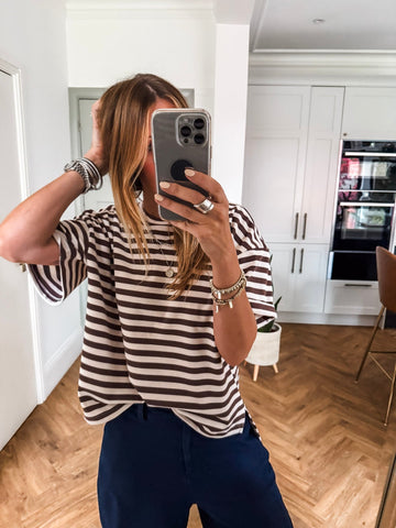 Our bestselling FIKA Super Soft T Shirt is back! Now available in a beautiful brown and cream stripe. After multiple sell-outs, this slow fashion favourite returns in a fresh new shade, ready to become your most-worn piece for seasons to come.Crafted from premium, heavier-weight jersey fabric, Sara is loved for her super-soft feel, flattering fit, and versatile design. The classic stripe and relaxed A-line silhouette create a polished yet effortless look that suits every body shape and style.Made using surplus fabrics, this piece gives new life to quality materials that would otherwise go to waste.