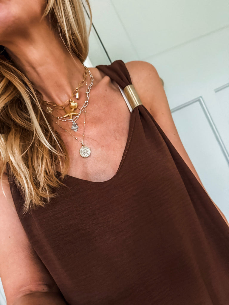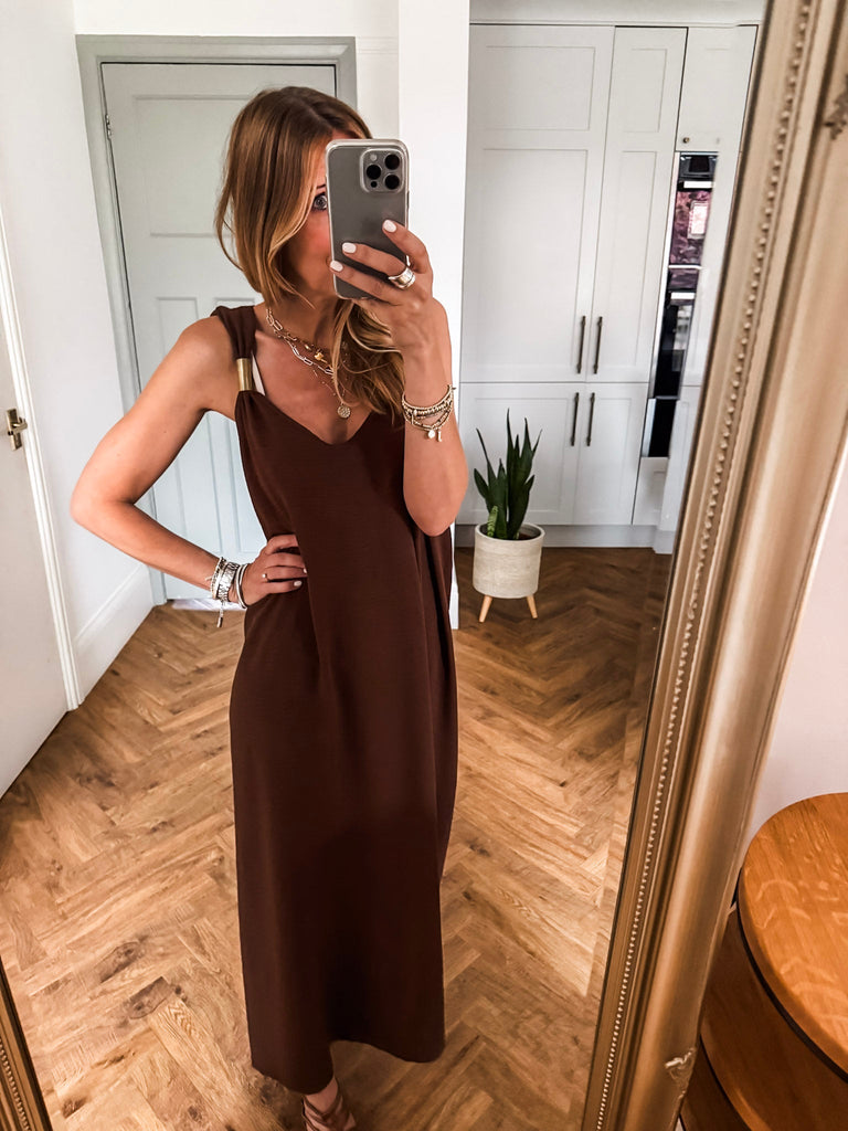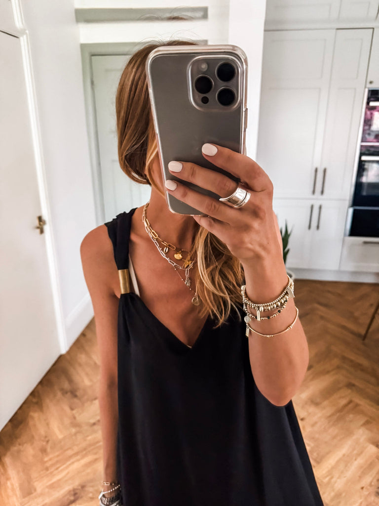 Radiate effortless elegance in the Golden Hour Maxi Dress, designed with a fluid silhouette and a flattering deep V neckline. Subtle gold accents catch the light for a refined touch of shimmer. Perfectly polished yet easy to wear, it’s your go-to for elevated everyday moments or special evenings out.