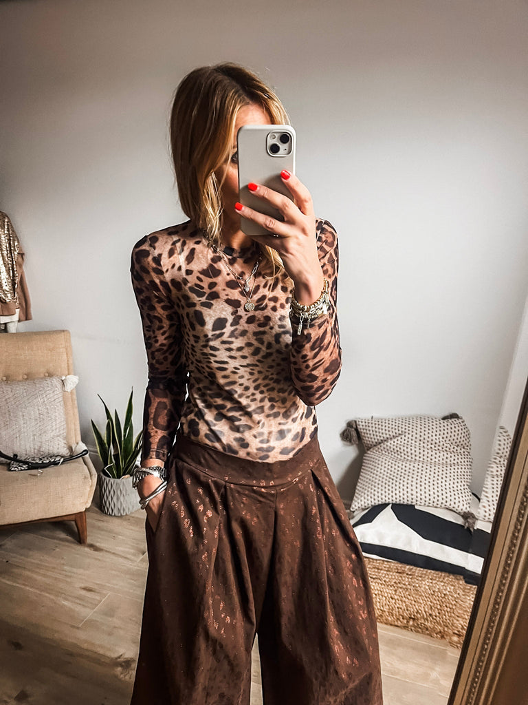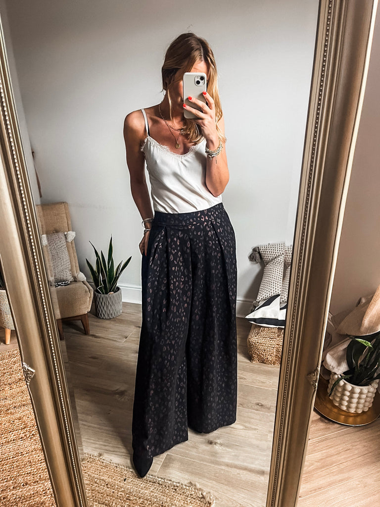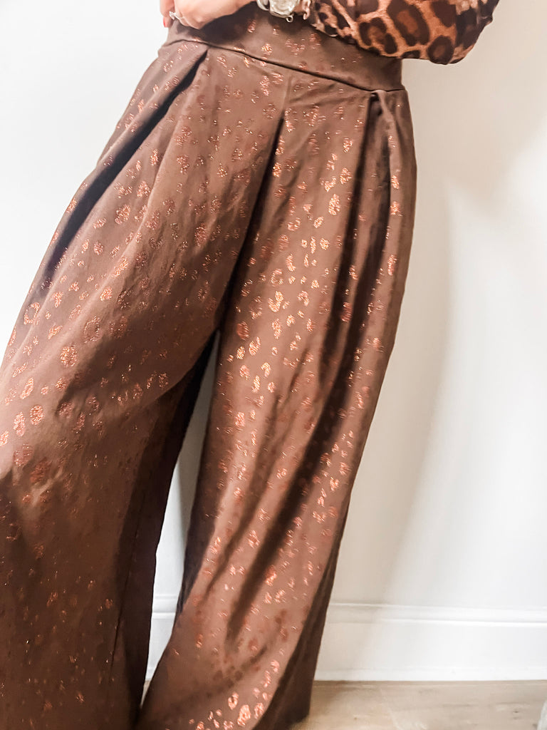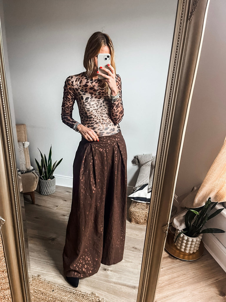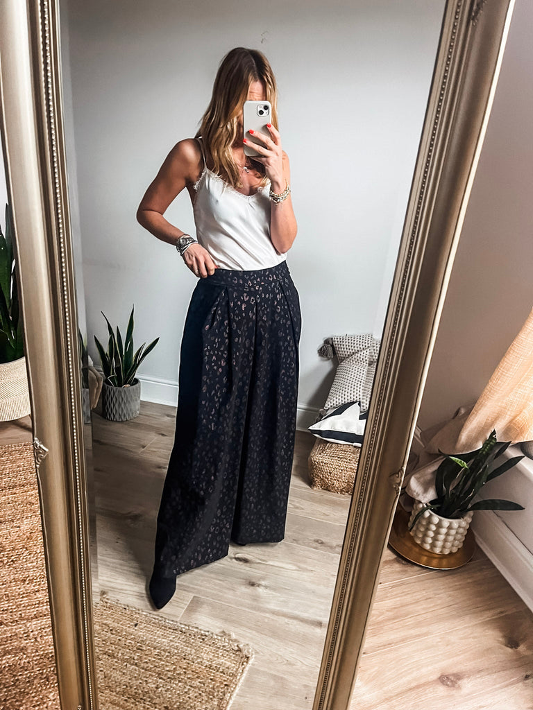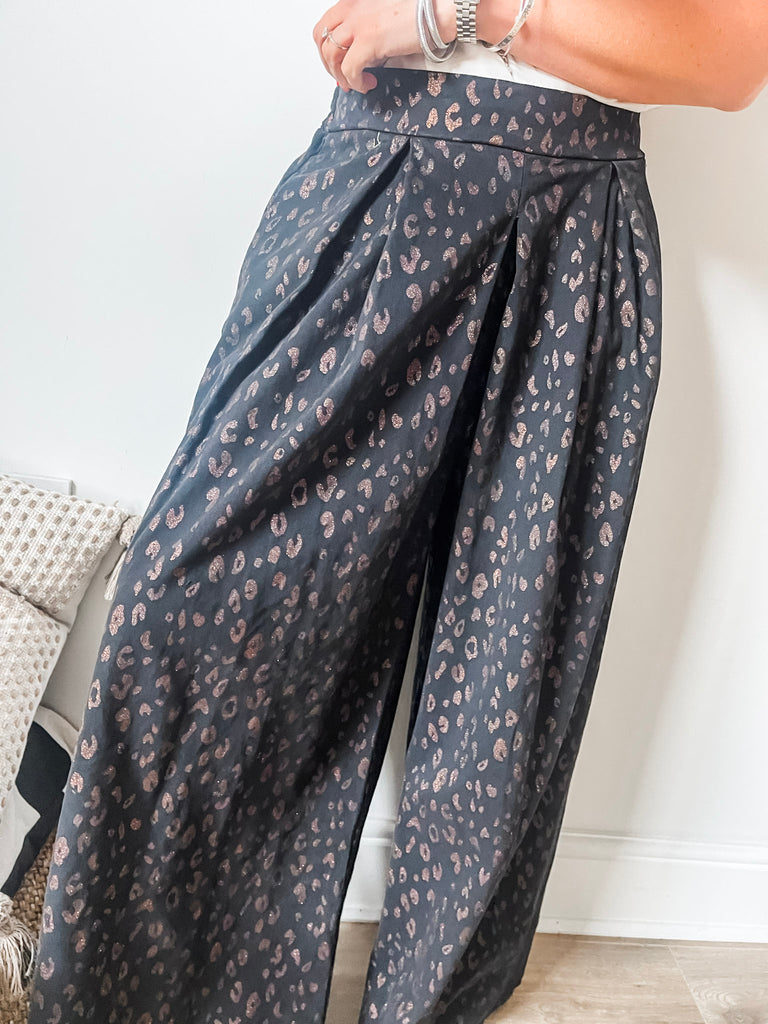 Embrace your bold side with our Plus Size Glitter Leopard Wide Leg Trousers. Designed with eye-catching glitter details and a flattering wide leg, they’re made for turning heads. Effortlessly stylish and comfortable, these trousers are your go-to for making a statement.