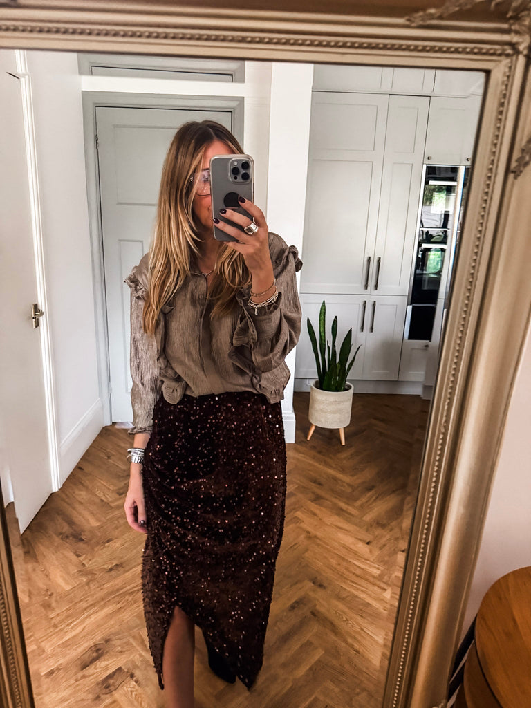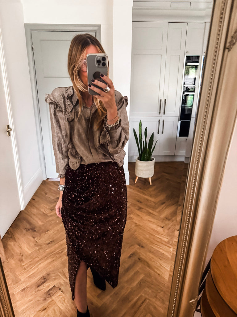 Style this blouse with high-waisted trousers or a sleek midi skirt for a polished party look. Add strappy heels and a clutch to enhance its glamorous edge. Keep accessories minimal to let the sparkle take center stage.
