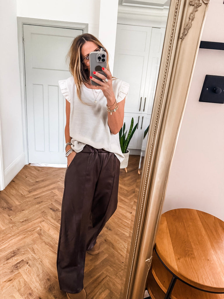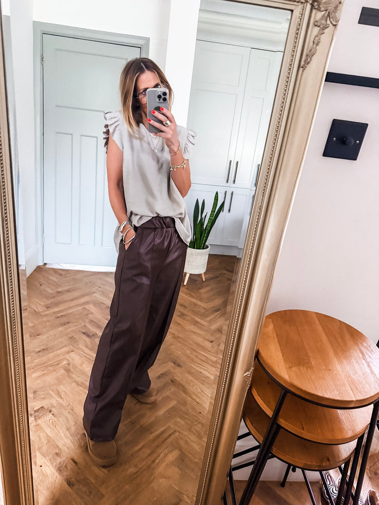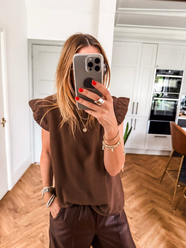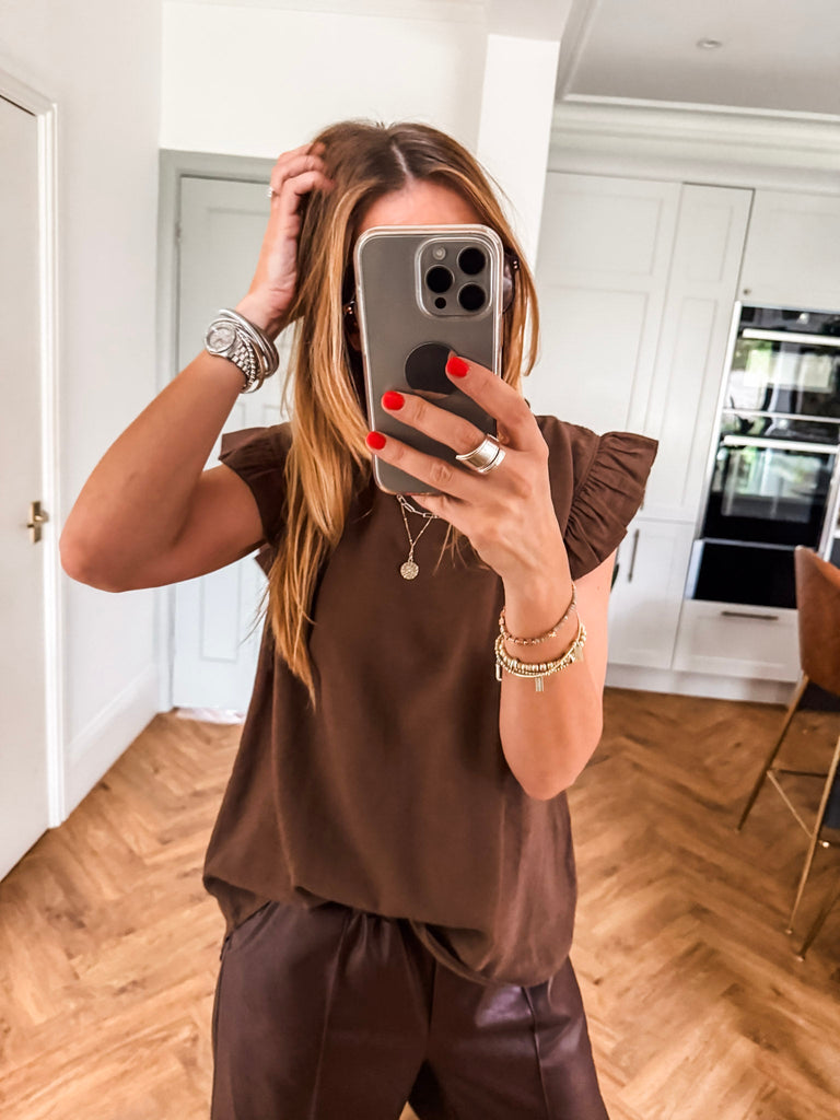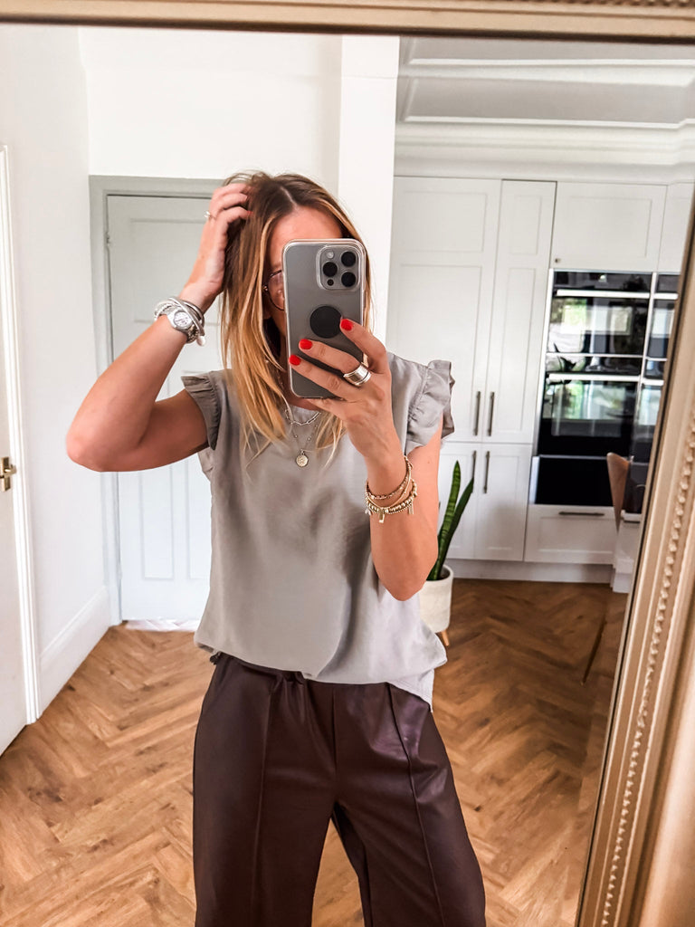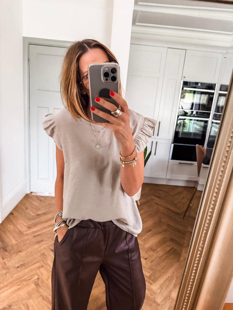Elevate your wardrobe with the Frill Sleeve Button Back top, a versatile piece that effortlessly transitions between casual and formal occasions. With charming frill sleeves and button detailing down the back, this top adds a touch of elegance and femininity to your outfit. It's a must-have addition for both your everyday and special occasion outfits!