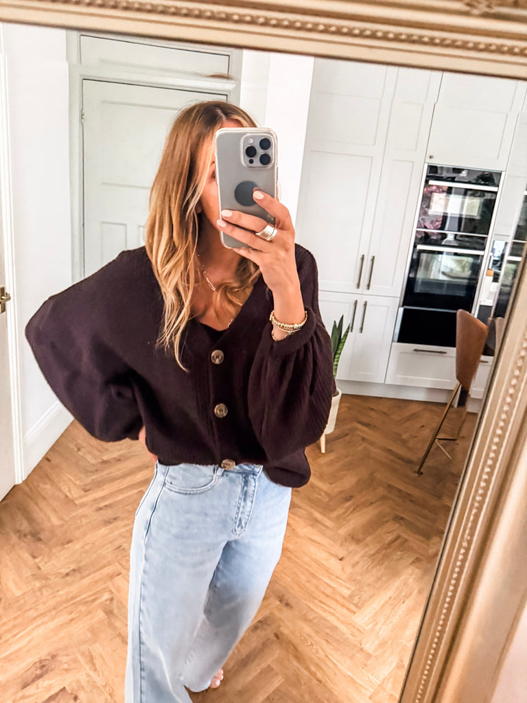 Layer the Balloon Sleeve Button Cardigan over a fitted tank and wide-leg jeans for a relaxed, on-trend look. Wear it buttoned up with a midi skirt and boots for an elevated everyday outfit. Add bold earrings or a structured bag to complete the vibe.