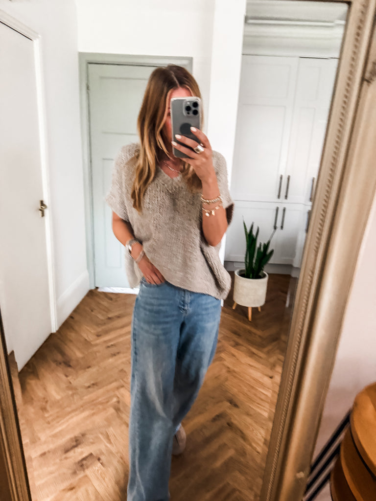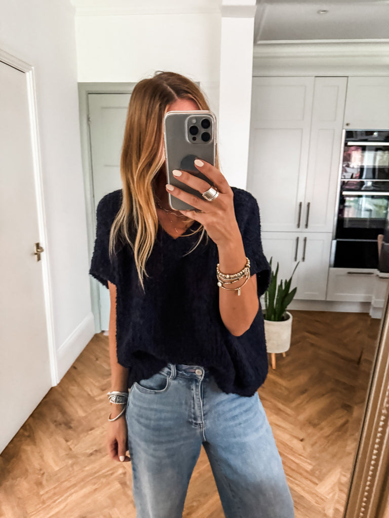 The V Neck Boucle Short Sleeve Jumper blends a relaxed, oversized fit with soft, textured boucle for effortless style. Featuring a flattering V-neck and airy short sleeves, it’s perfect for layering or wearing solo. A modern wardrobe staple with just the right balance of comfort and polish.
