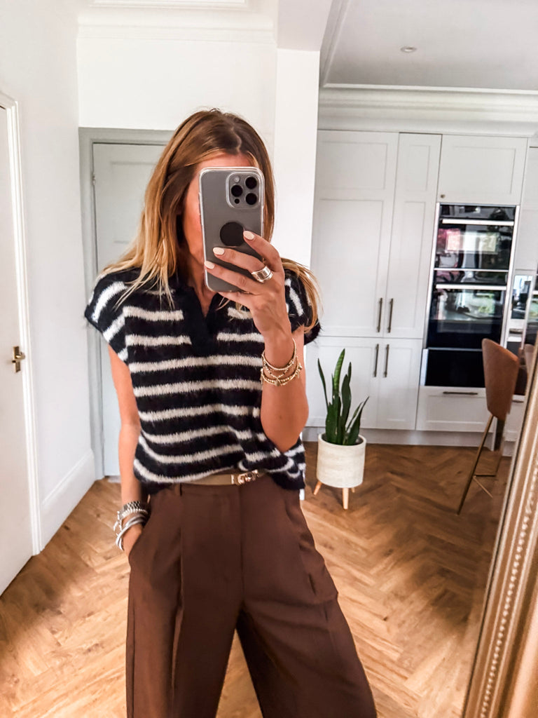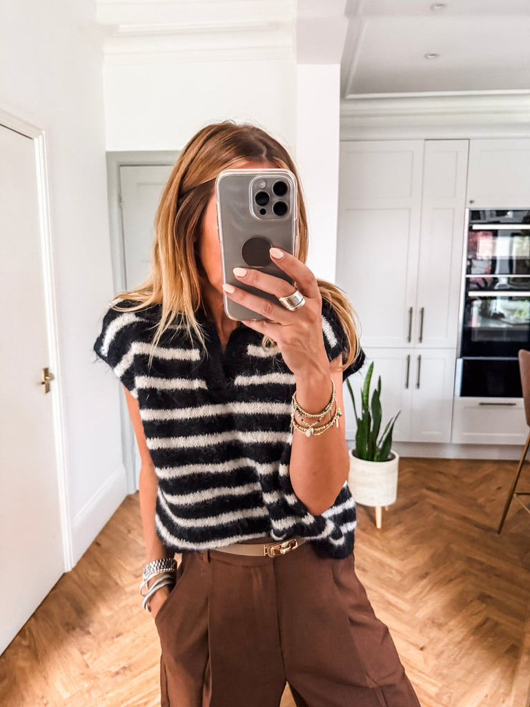 Add a fresh edge to your look with this collared striped knit vest. With its cropped fit, short sleeves, and bold stripes, it’s a modern take on a classic style. Lightweight and versatile, it’s perfect for layering or wearing solo when the weather warms up.