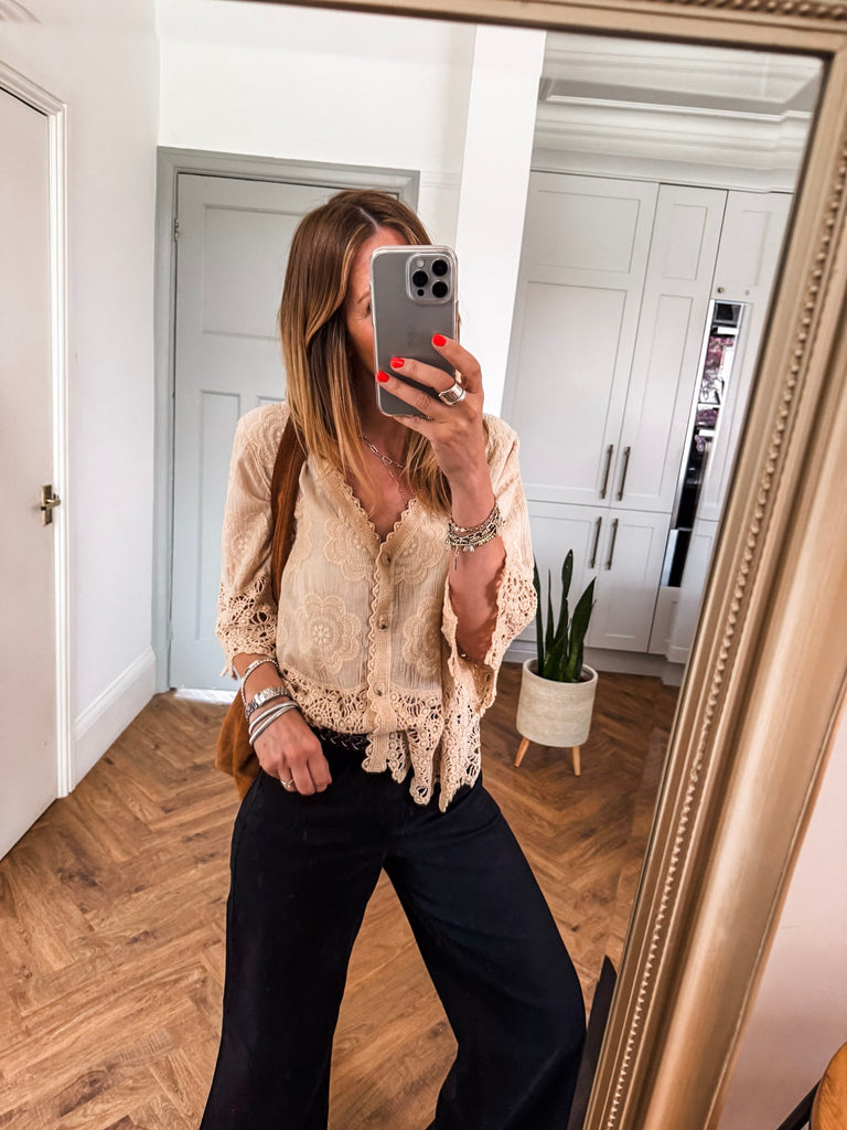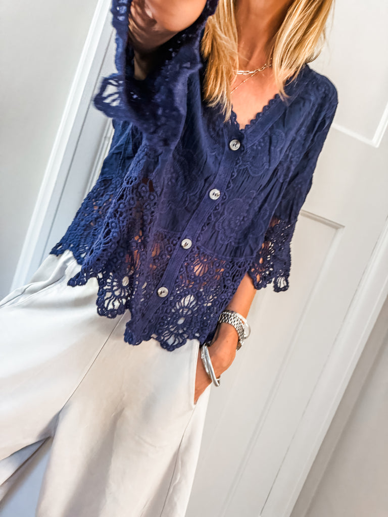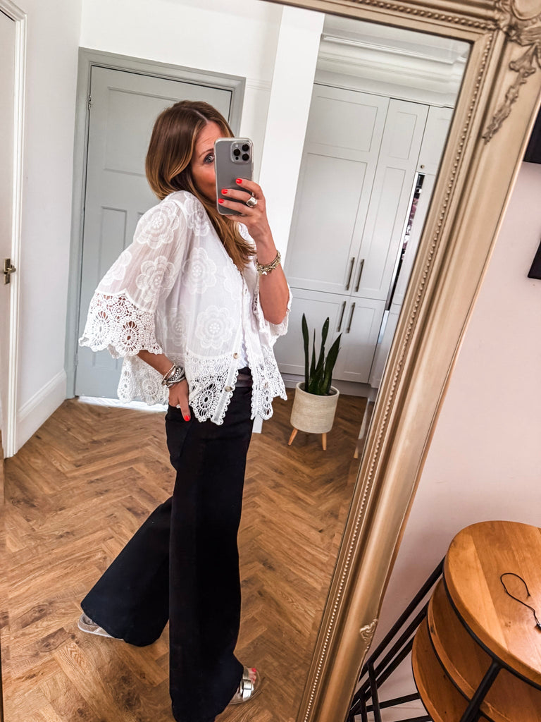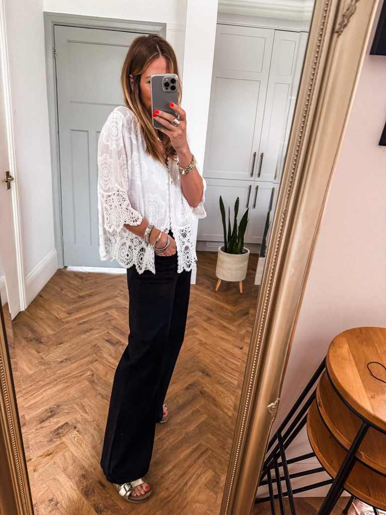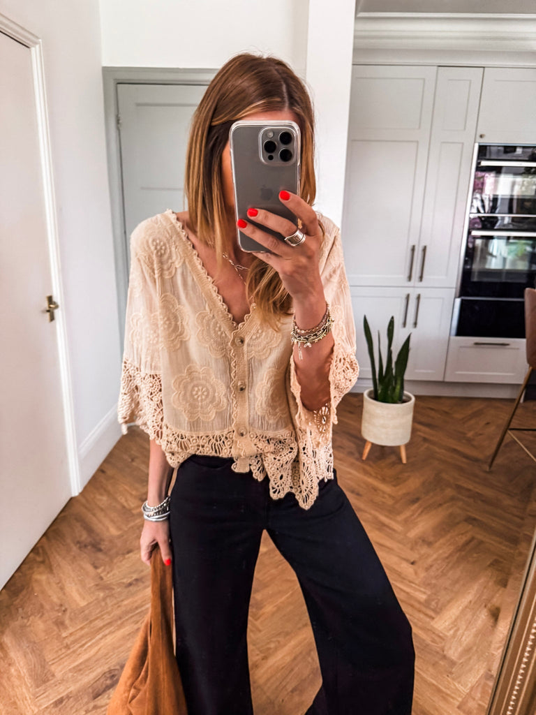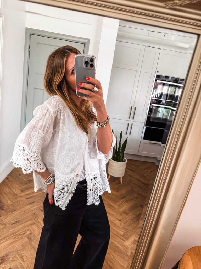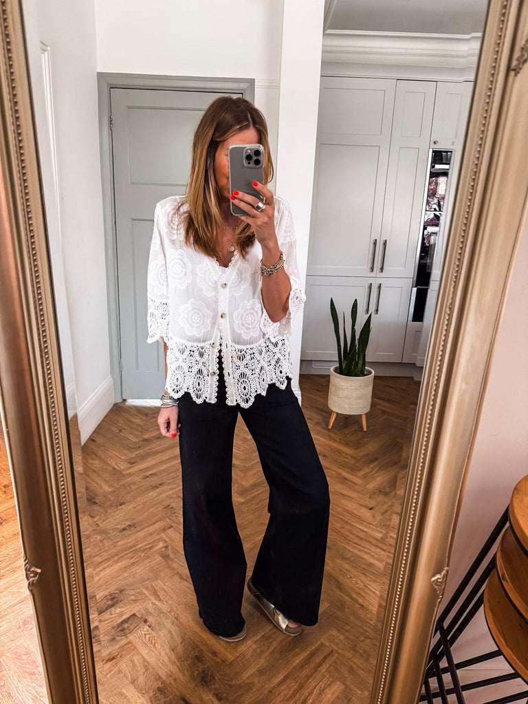 This top is gorgeous!! Channel effortless cool with our Crochet Button Top, featuring playful broderie and crochet details. The relaxed fit and V-neckline strike the perfect balance of comfort and style. A go-to piece for laid-back days with a touch of charm. Fabric is 100% cotton.
