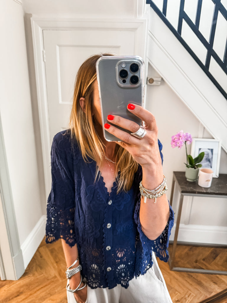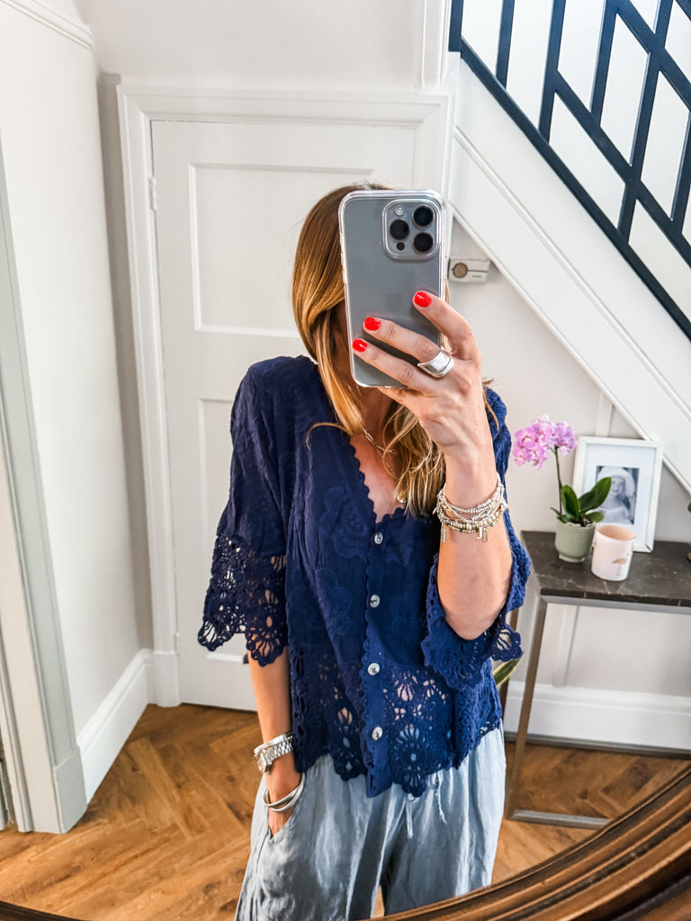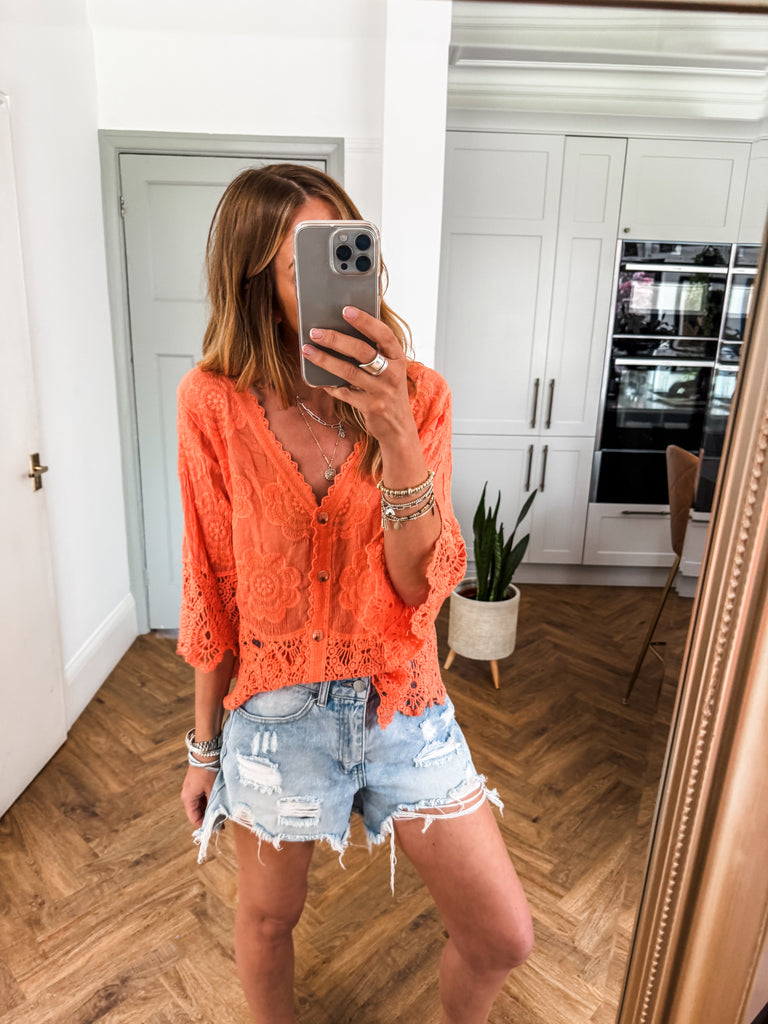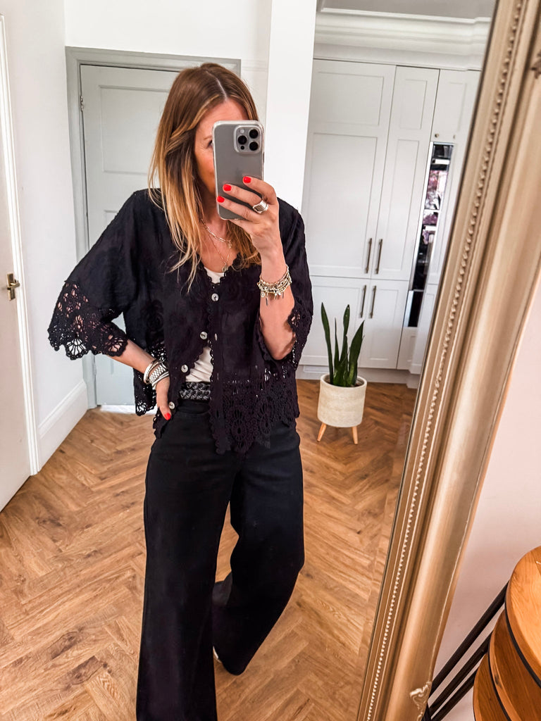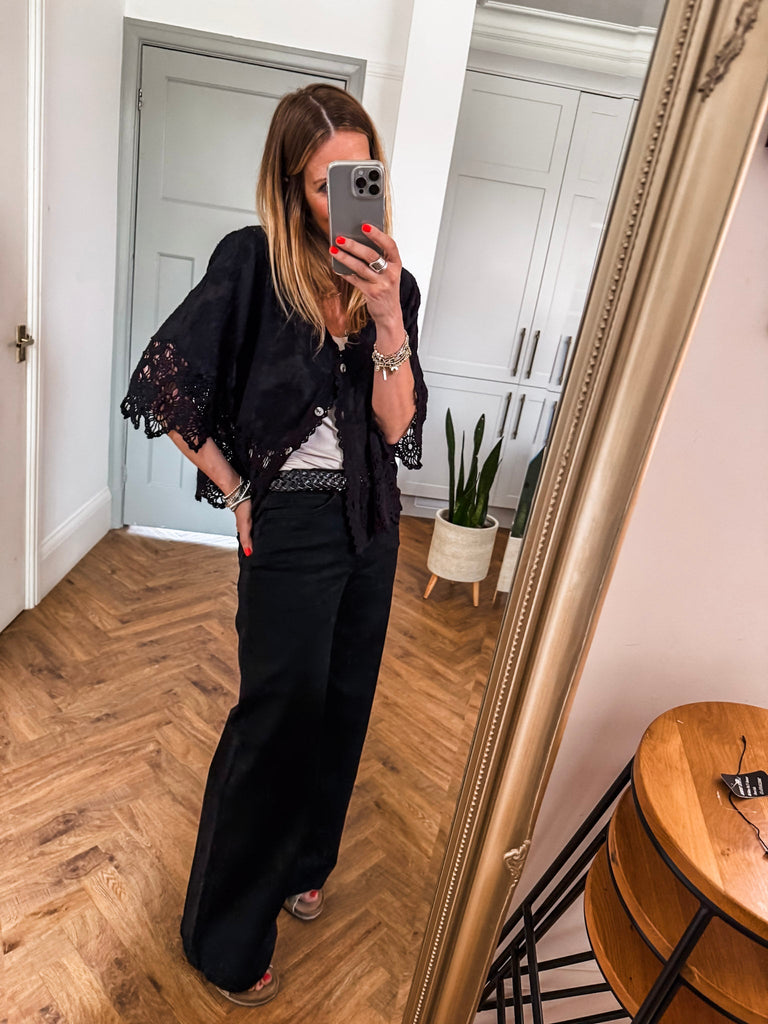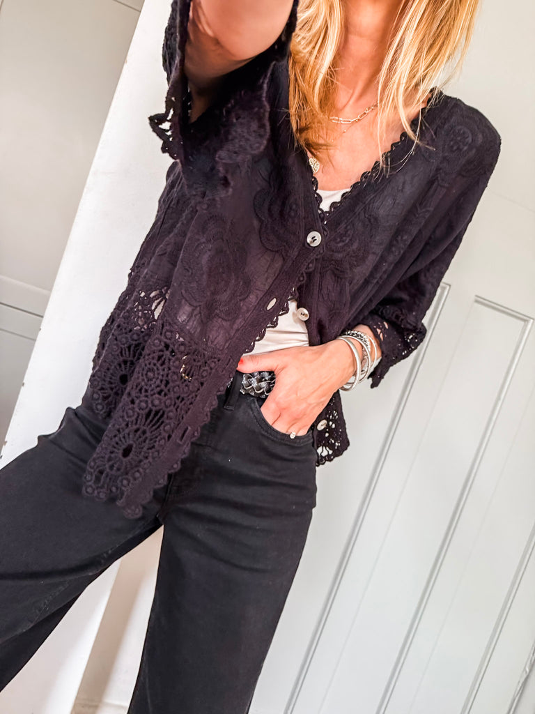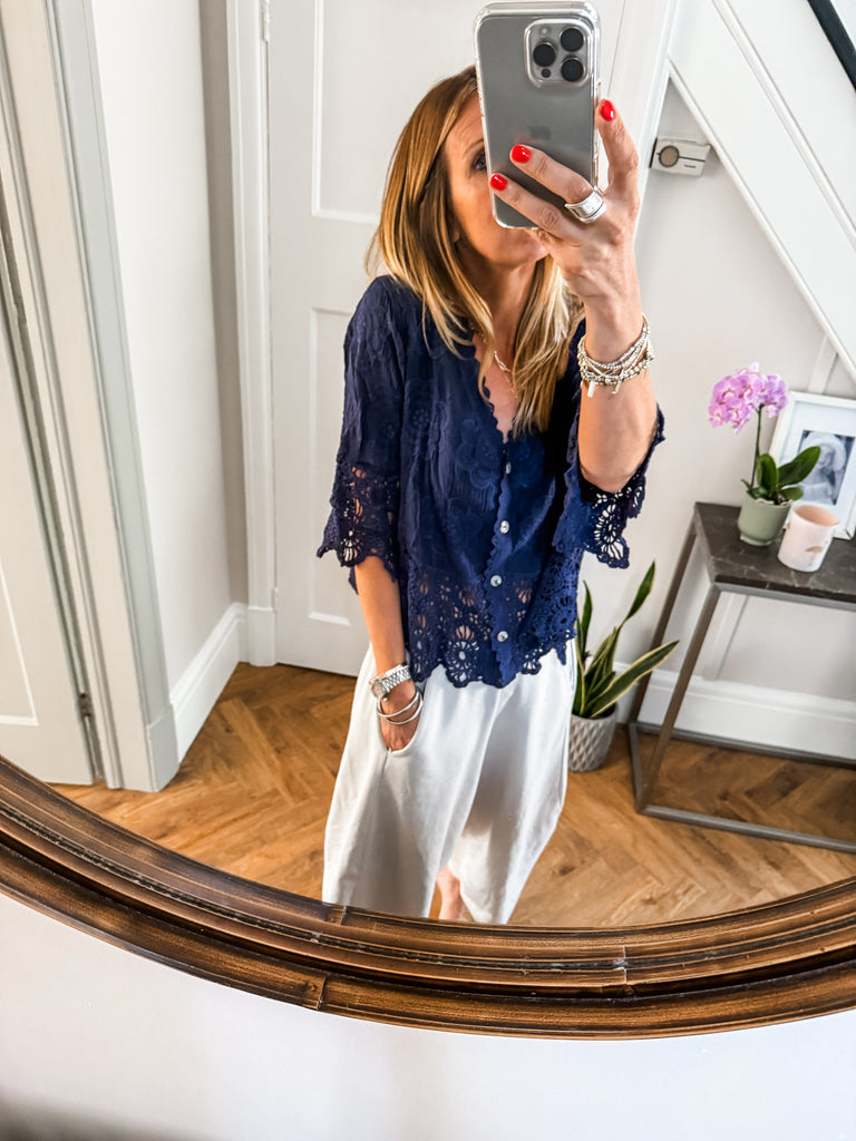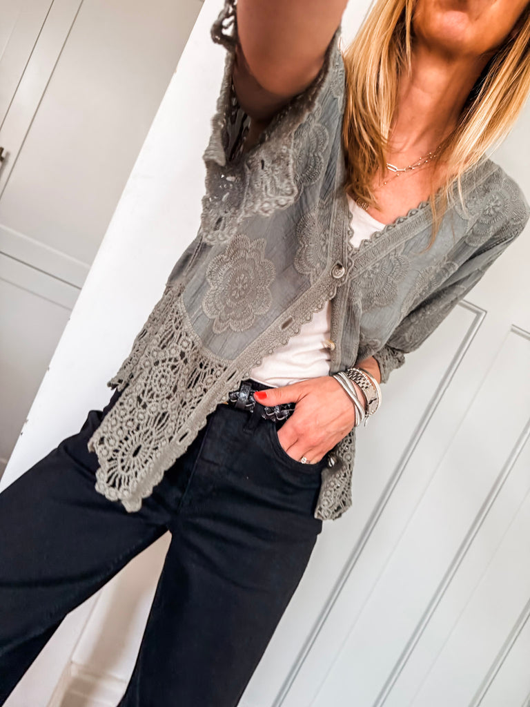 This top is gorgeous!! Channel effortless cool with our Crochet Button Top, featuring playful broderie and crochet details. The relaxed fit and V-neckline strike the perfect balance of comfort and style. A go-to piece for laid-back days with a touch of charm. Fabric is 100% cotton.