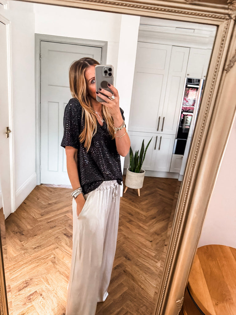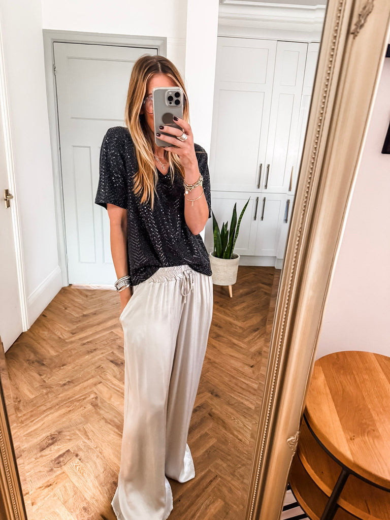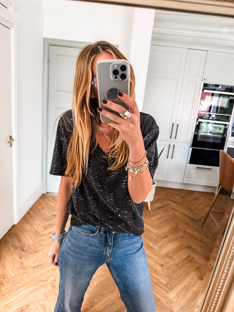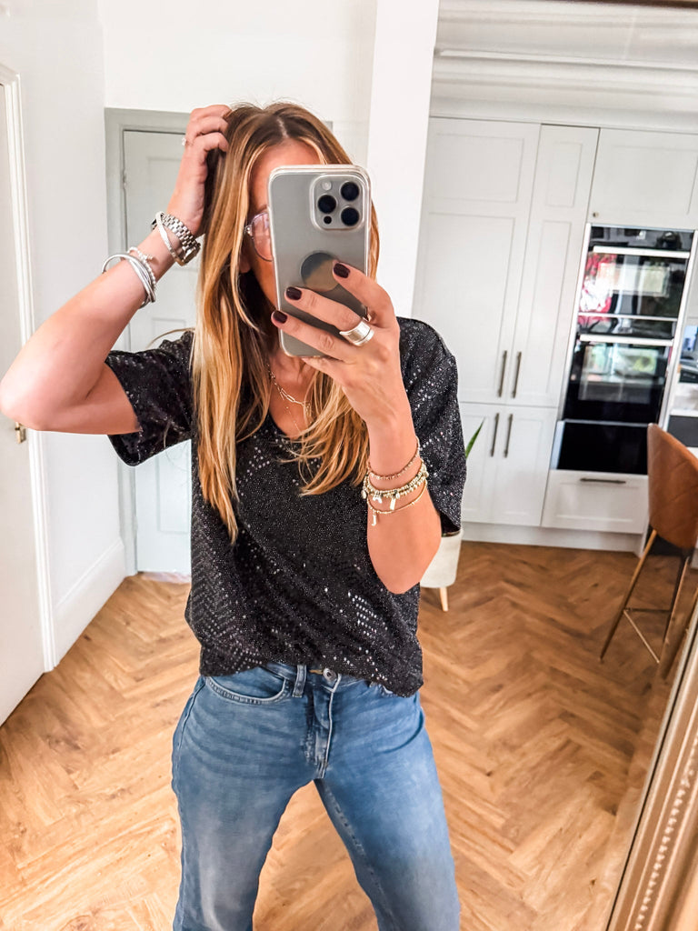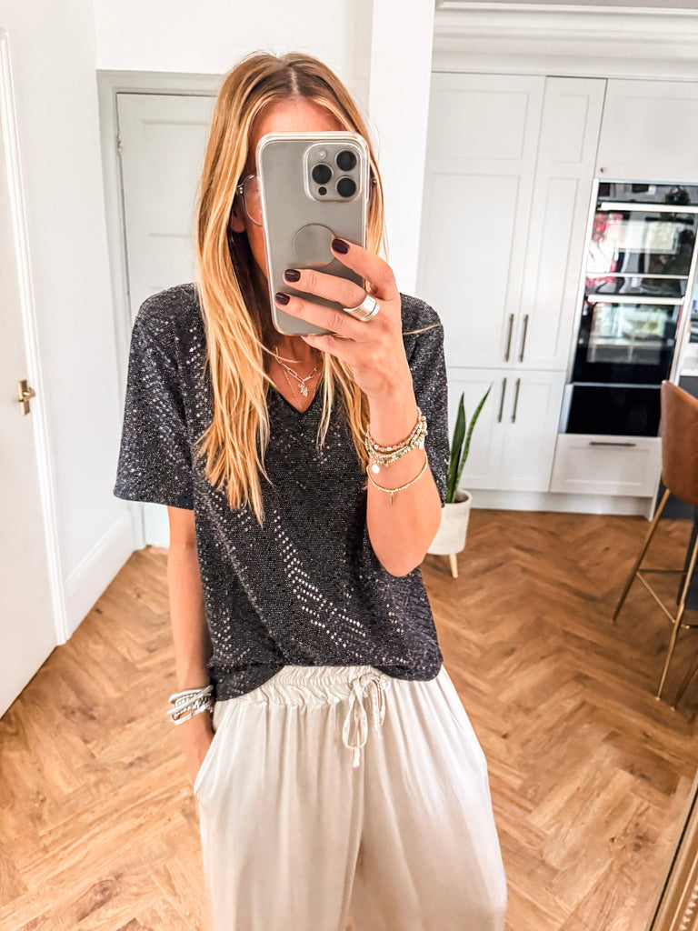 We love this top for its perfect mix of sparkle and comfort. flattering crop make it as wearable as it is striking. It’s a standout piece that turns every outfit into a statement.