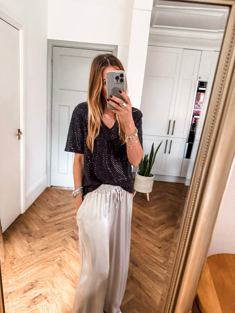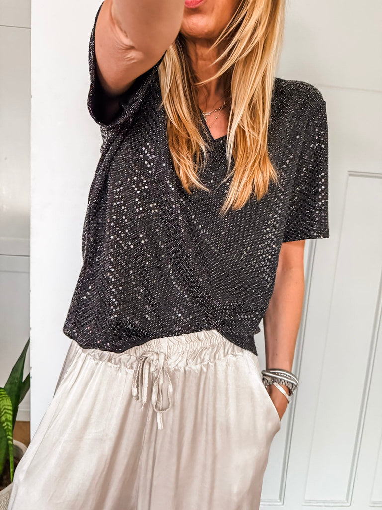 Shine in this ICHI Nelenia Top , designed to catch every eye. With short sleeves, fully lined and a flattering V neckline, it blends comfort with bold style. Perfect for nights out, festivals, or any moment you want to make a statement.