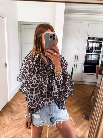 Pair this with denim shorts and unleash your wild side with this Leopard Pussy Bow Blouse, blending bold print with effortless polish. The loose fit, elegant sleeves, and dramatic bow detail create a look that’s both relaxed and refined. Perfect for making a statement with minimal effort.