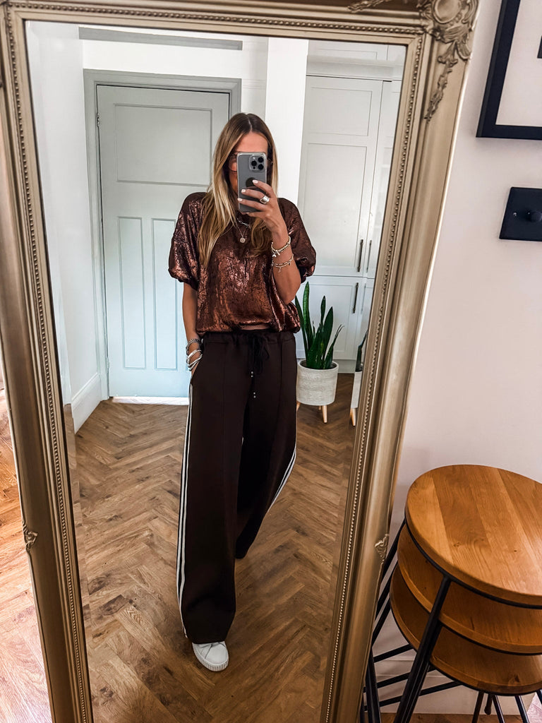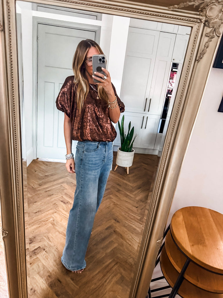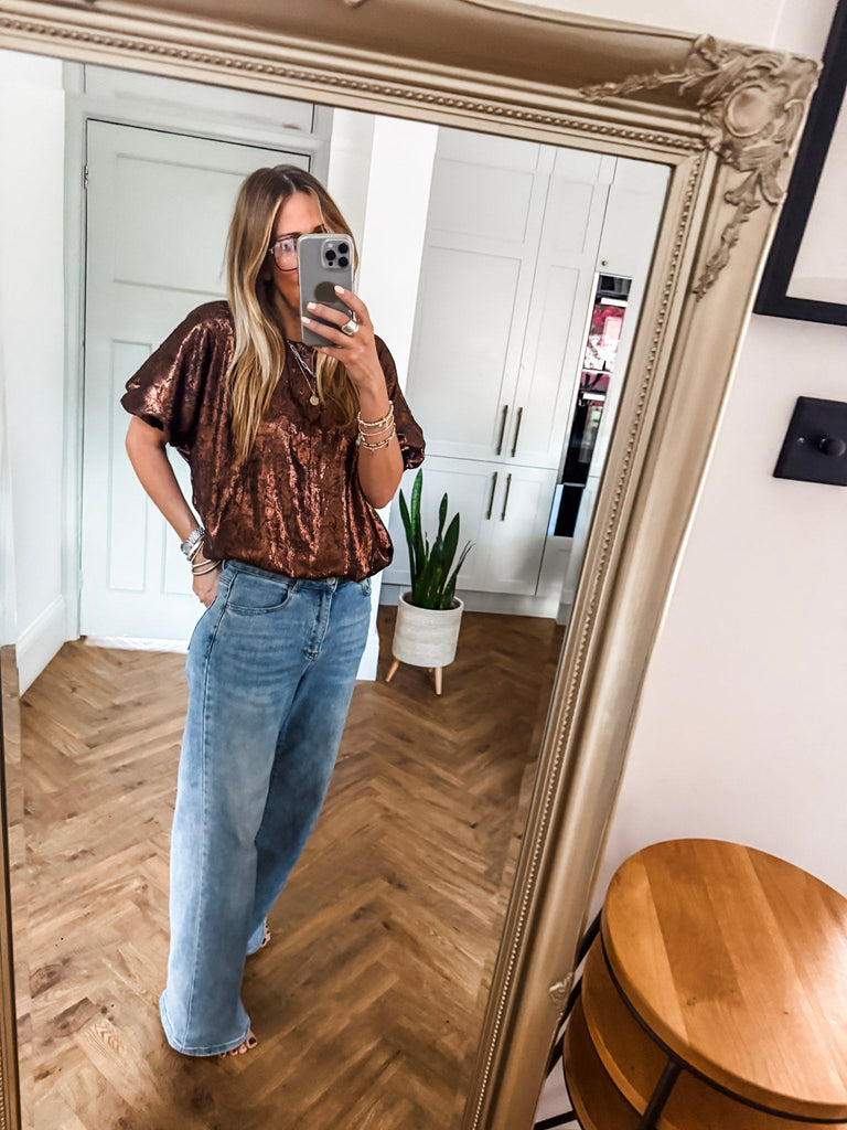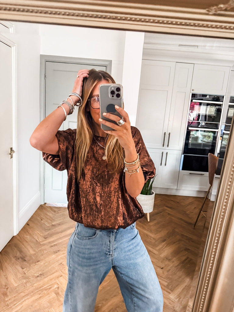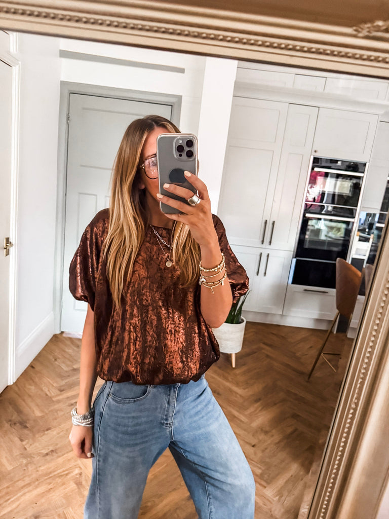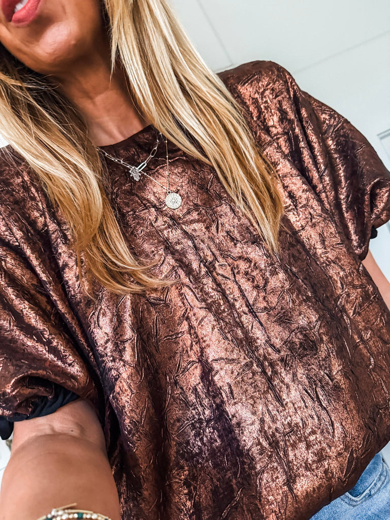 Shimmer with style in this metallic bubble hem top. Featuring playful puff sleeves, a cropped fit, and a bold back keyhole, it’s effortlessly modern with just the right amount of edge. Perfect for elevating any look, day or night.