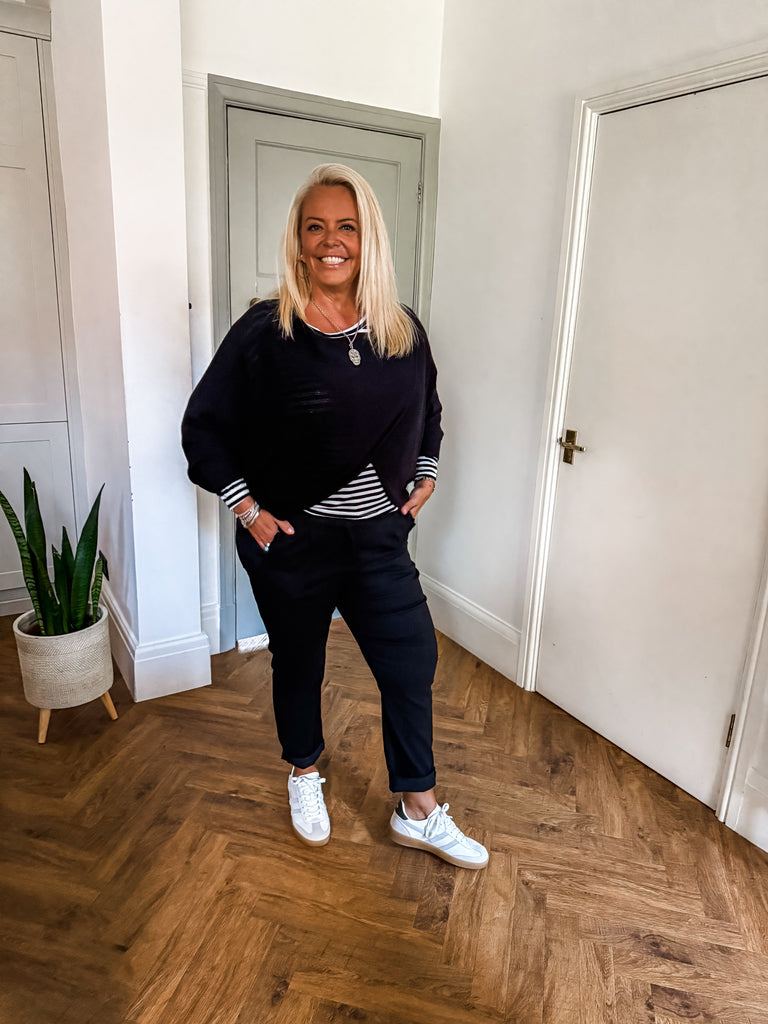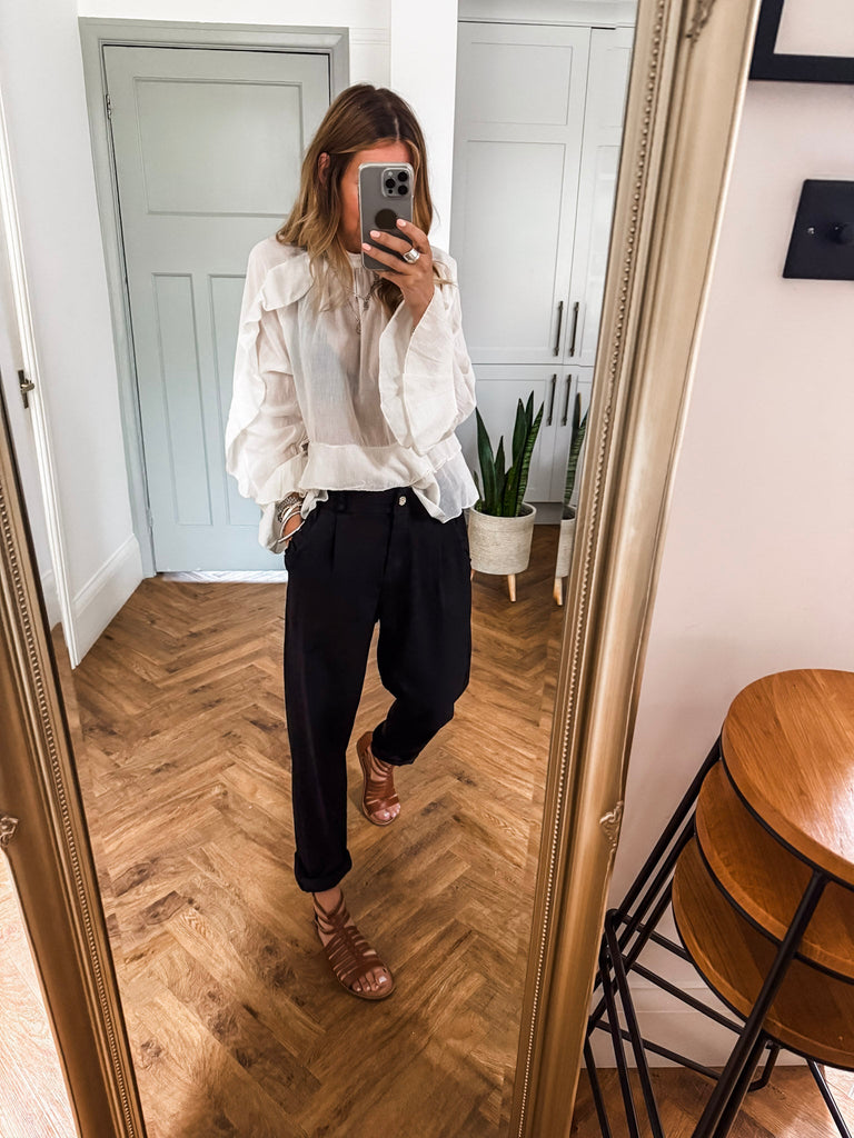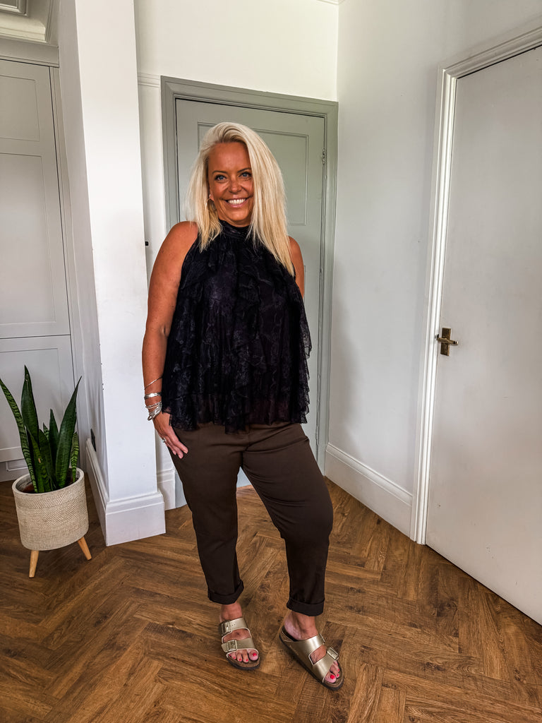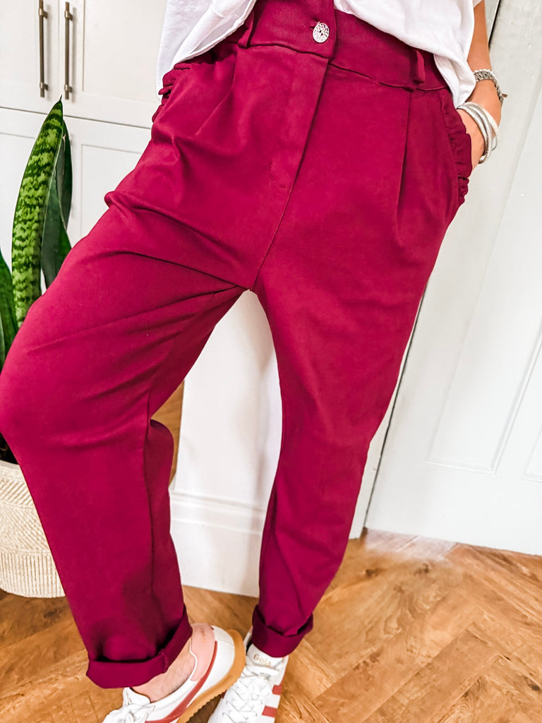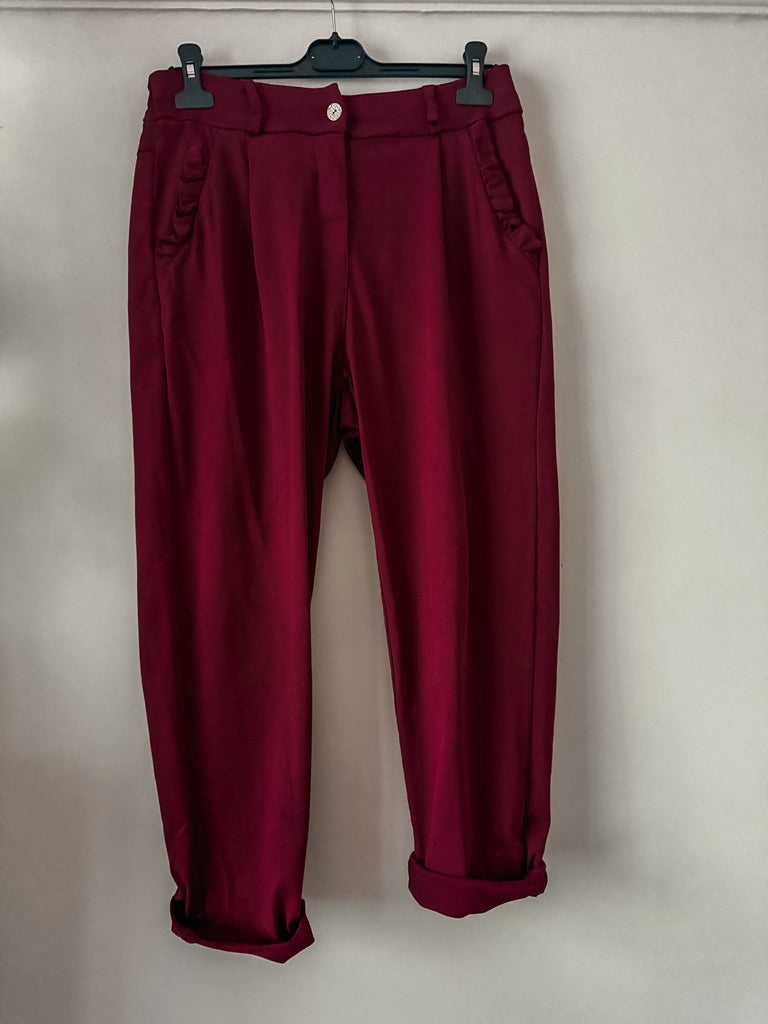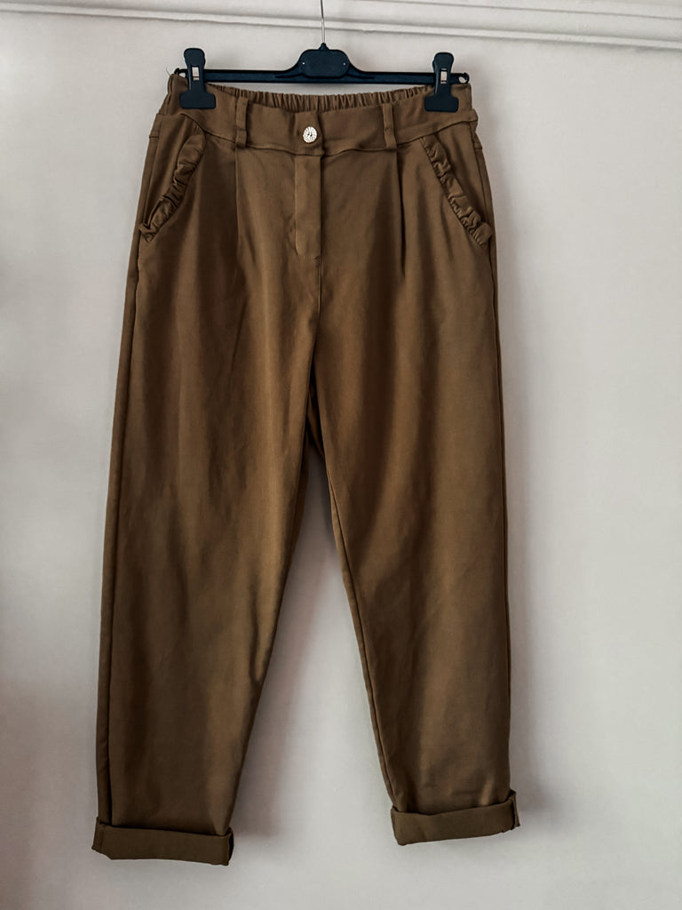 These chic tailored trousers are a must have for your wardrobe! Crafted from a comfortable stretchy fabric for ease and movement. Designed with a flattering tapered leg, they feature elegant front pleats and an elasticated back waistband for a perfect fit. The front side pockets are finished with a delicate frill detail, adding a feminine touch to the structured silhouette. A gold button fastening and belt loops at the waist complete the look with a polished finish — ideal for both smart and casual styling.