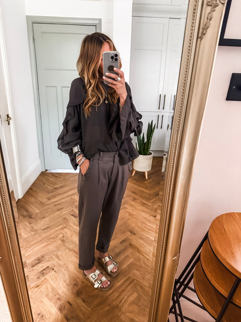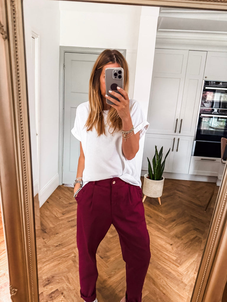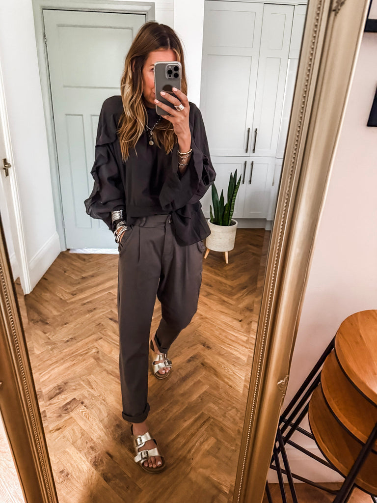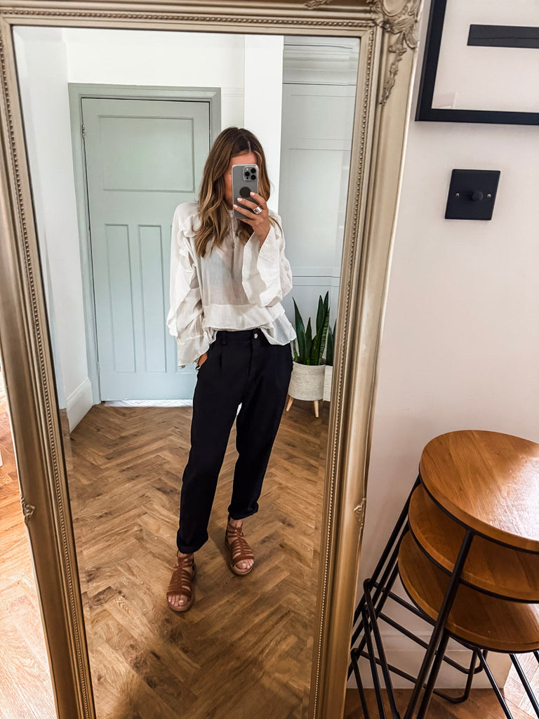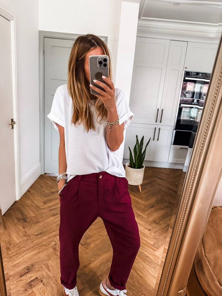 These chic tailored trousers are a must have for your wardrobe! Crafted from a comfortable stretchy fabric for ease and movement. Designed with a flattering tapered leg, they feature elegant front pleats and an elasticated back waistband for a perfect fit. The front side pockets are finished with a delicate frill detail, adding a feminine touch to the structured silhouette. A gold button fastening and belt loops at the waist complete the look with a polished finish — ideal for both smart and casual styling.