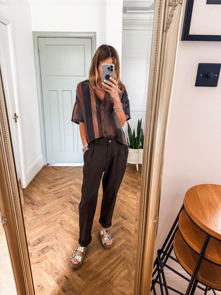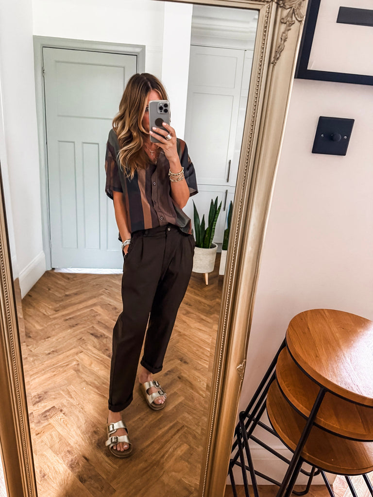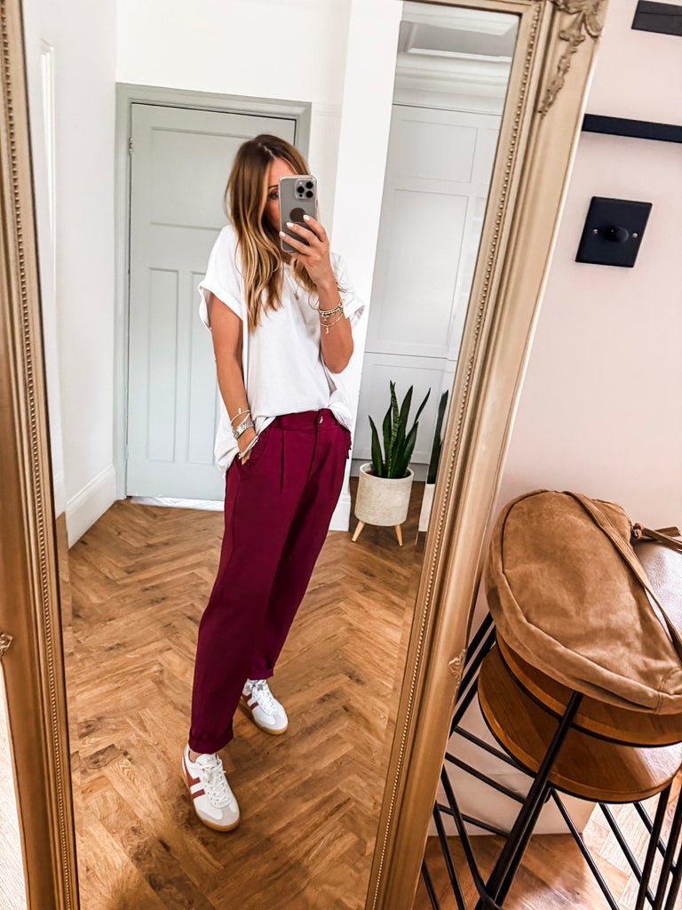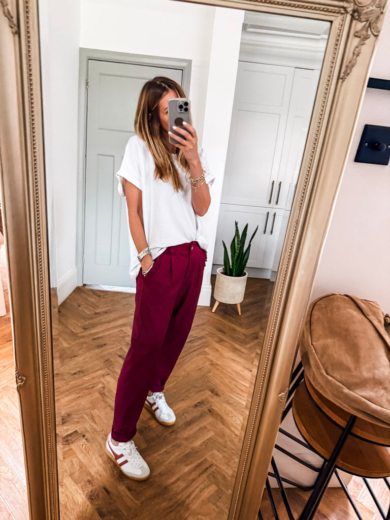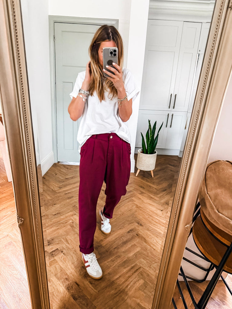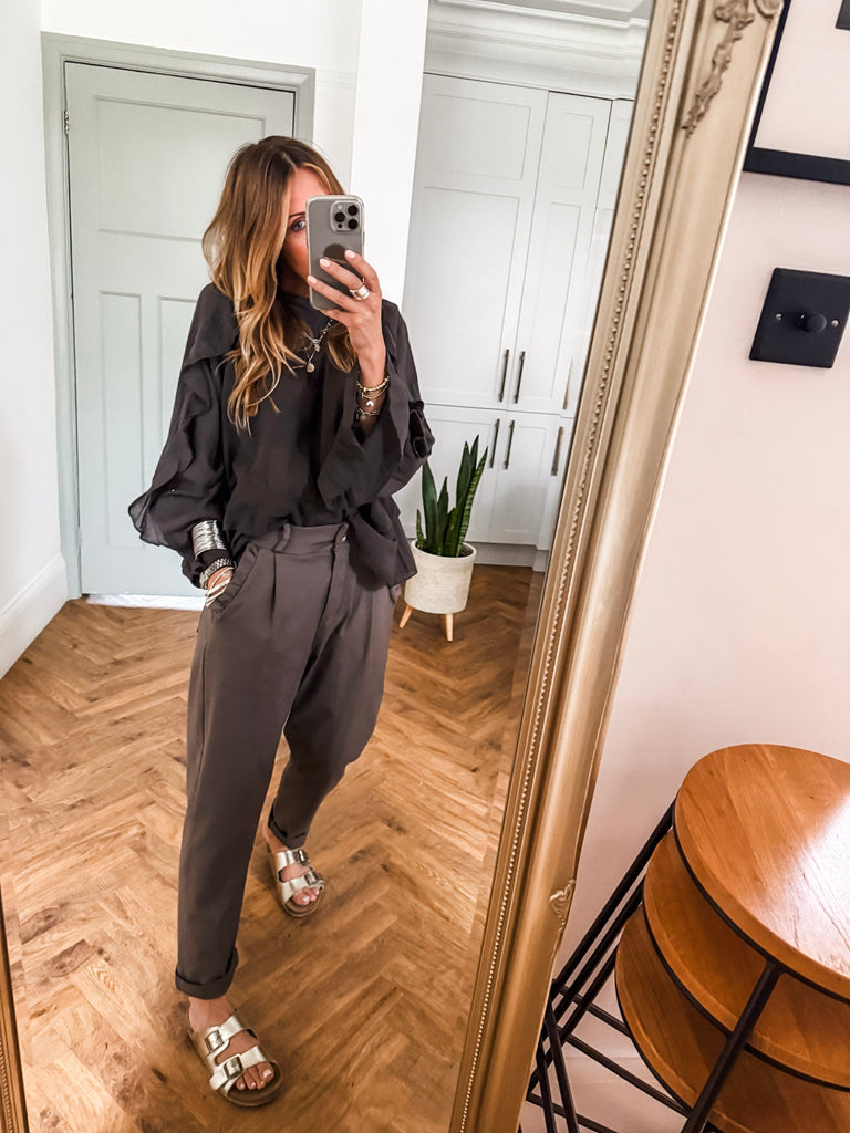 These chic tailored trousers are a must have for your wardrobe! Crafted from a comfortable stretchy fabric for ease and movement. Designed with a flattering tapered leg, they feature elegant front pleats and an elasticated back waistband for a perfect fit. The front side pockets are finished with a delicate frill detail, adding a feminine touch to the structured silhouette. A gold button fastening and belt loops at the waist complete the look with a polished finish — ideal for both smart and casual styling.