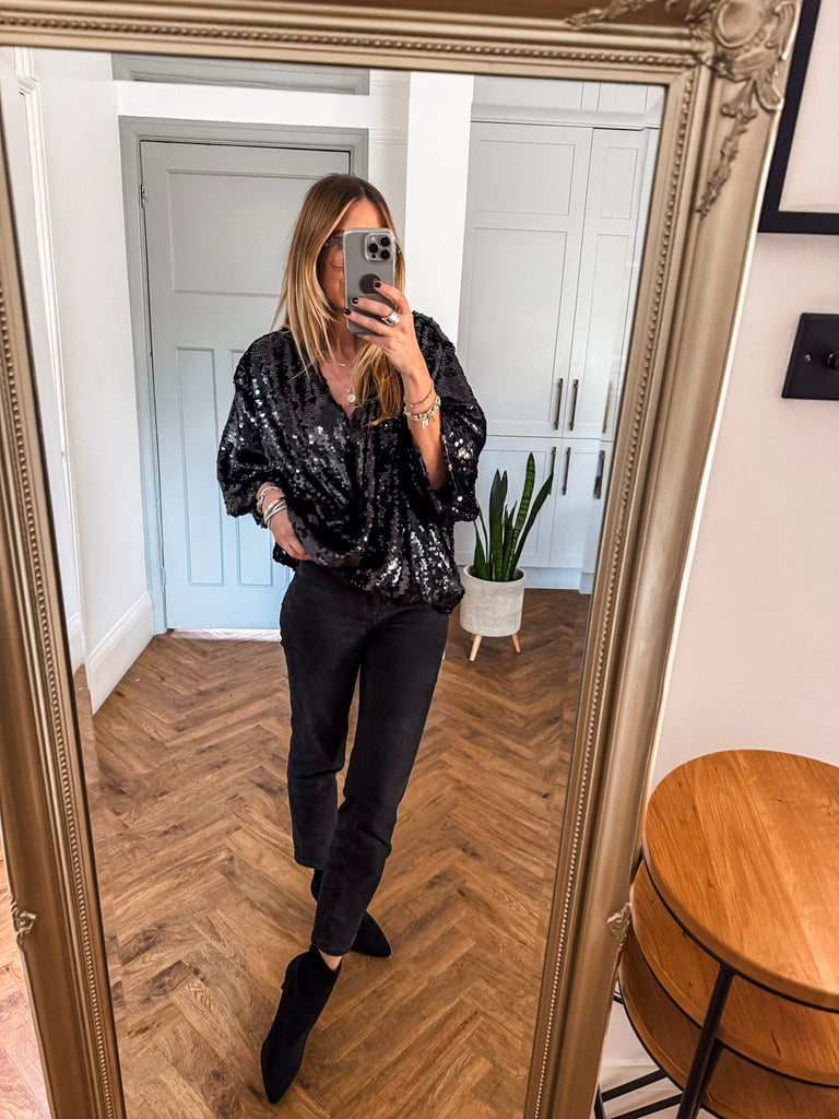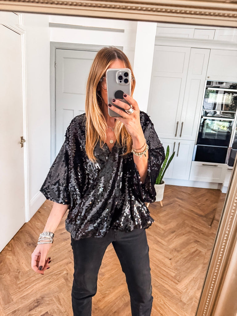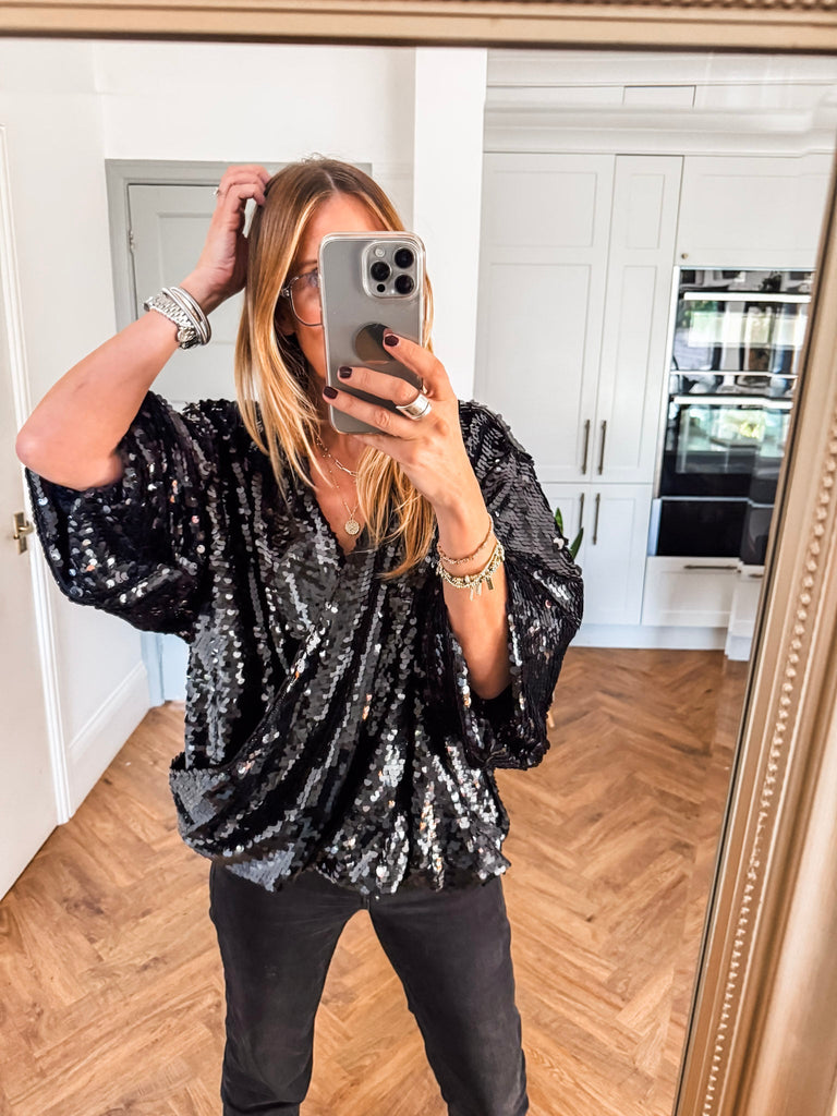 Shine in this Sequin Draped Top , designed to catch every eye. With short sleeves, fully lined and a flattering draped neckline, it blends comfort with bold style. Perfect for nights out, festivals, or any moment you want to make a statement.
