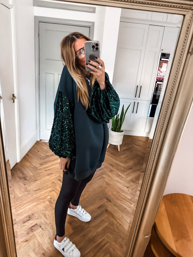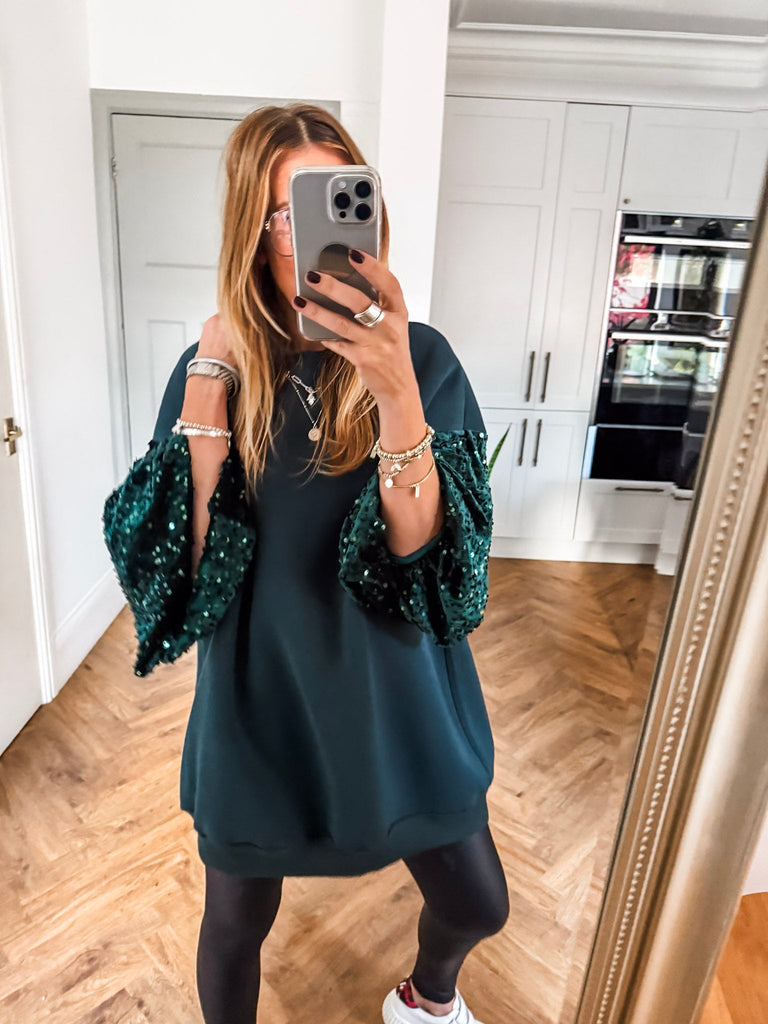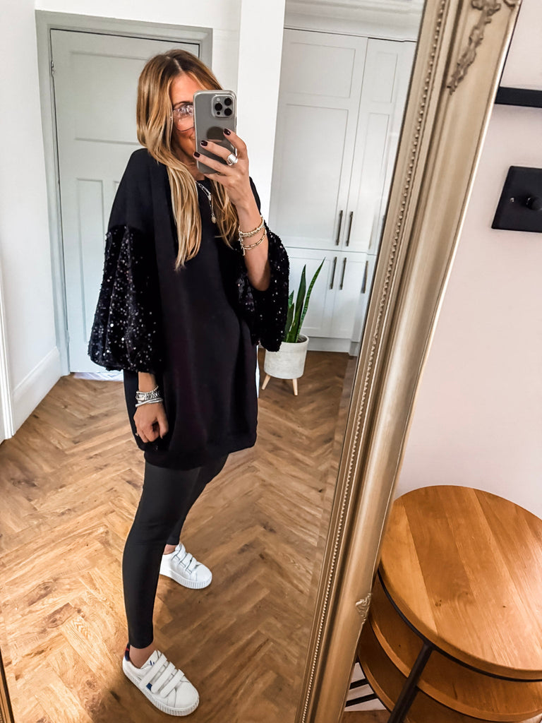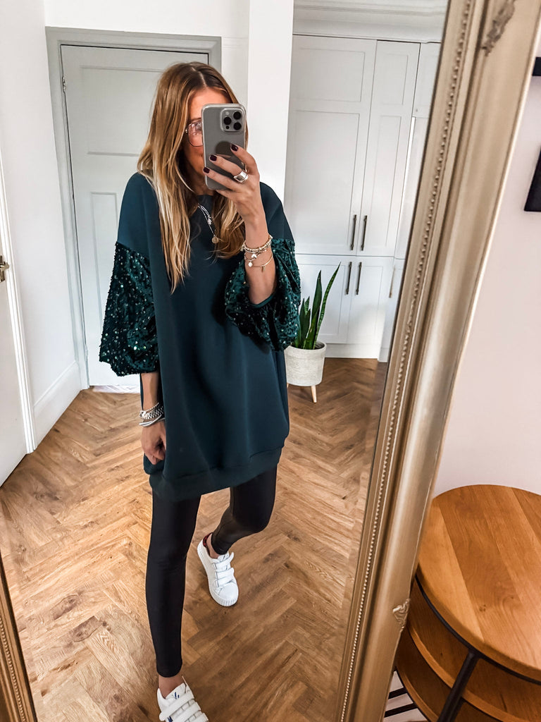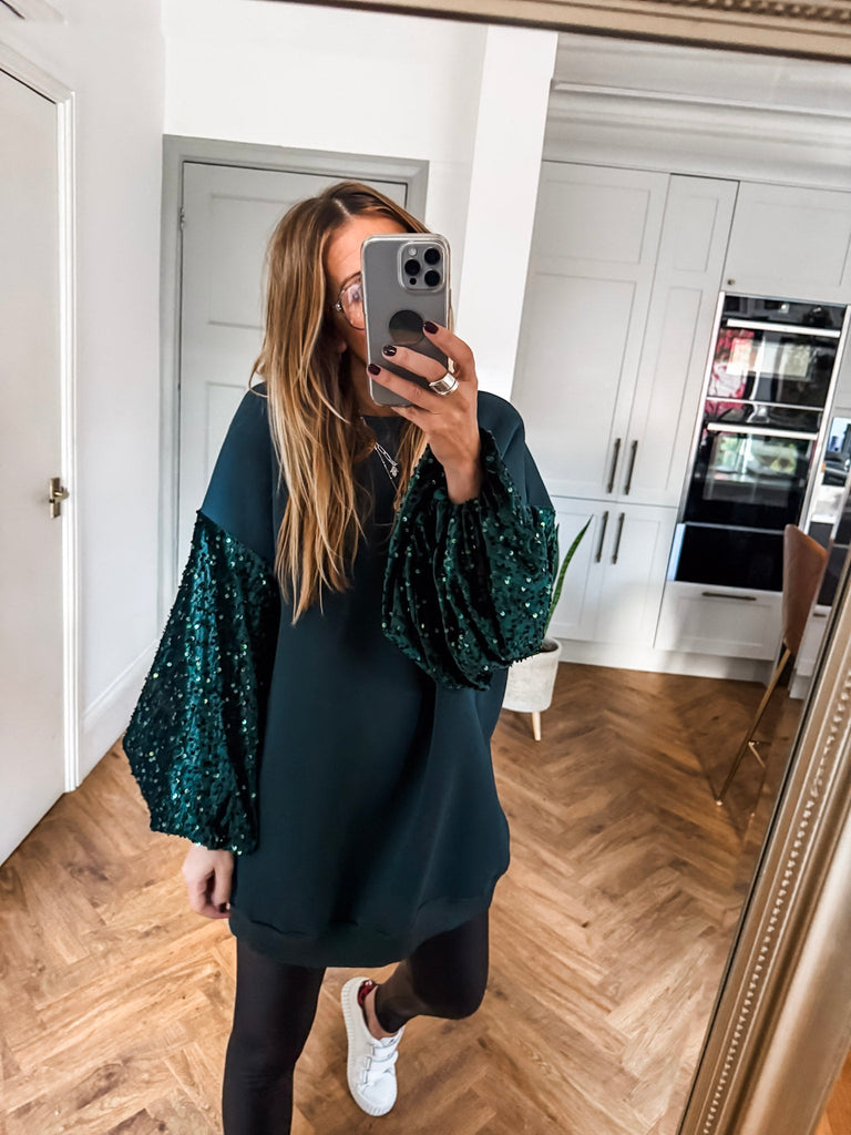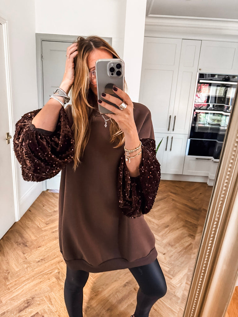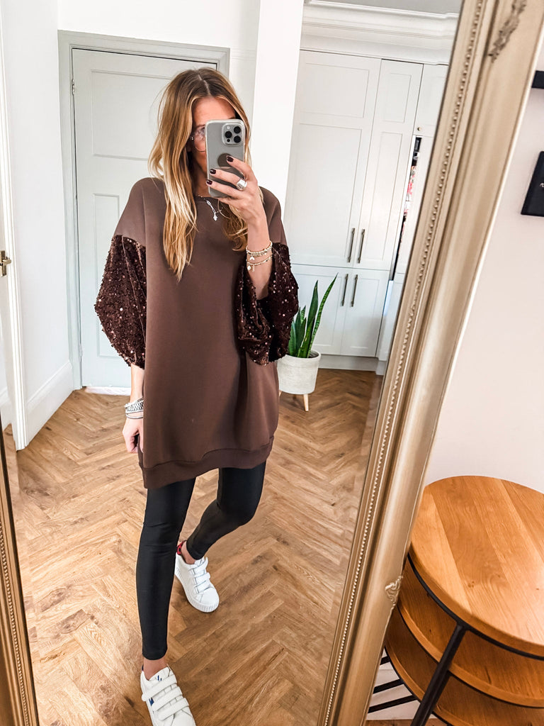 Turn heads in this oversized tunic sweatshirt—where laid-back comfort meets statement sparkle. Crafted from soft sweat fabric with sequin-detailed sleeves, it’s the perfect blend of cosy and bold. Effortlessly cool, whether worn solo or layered for impact.