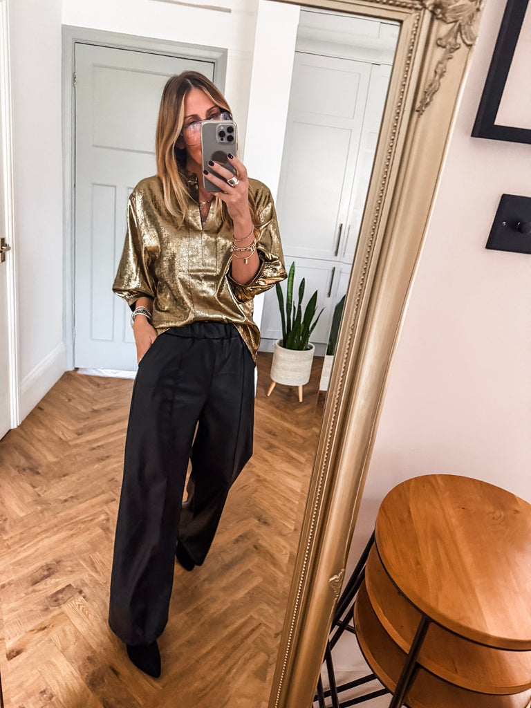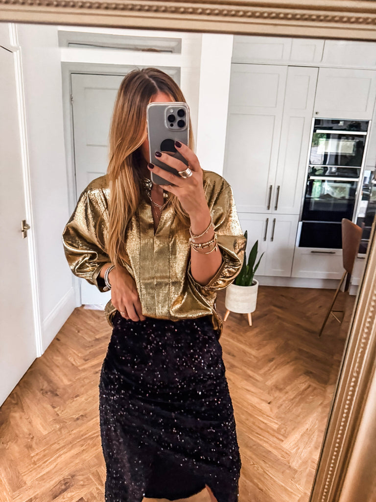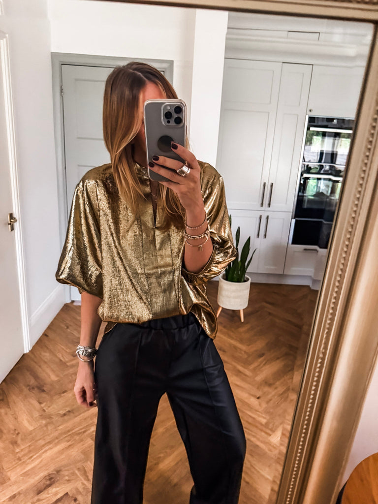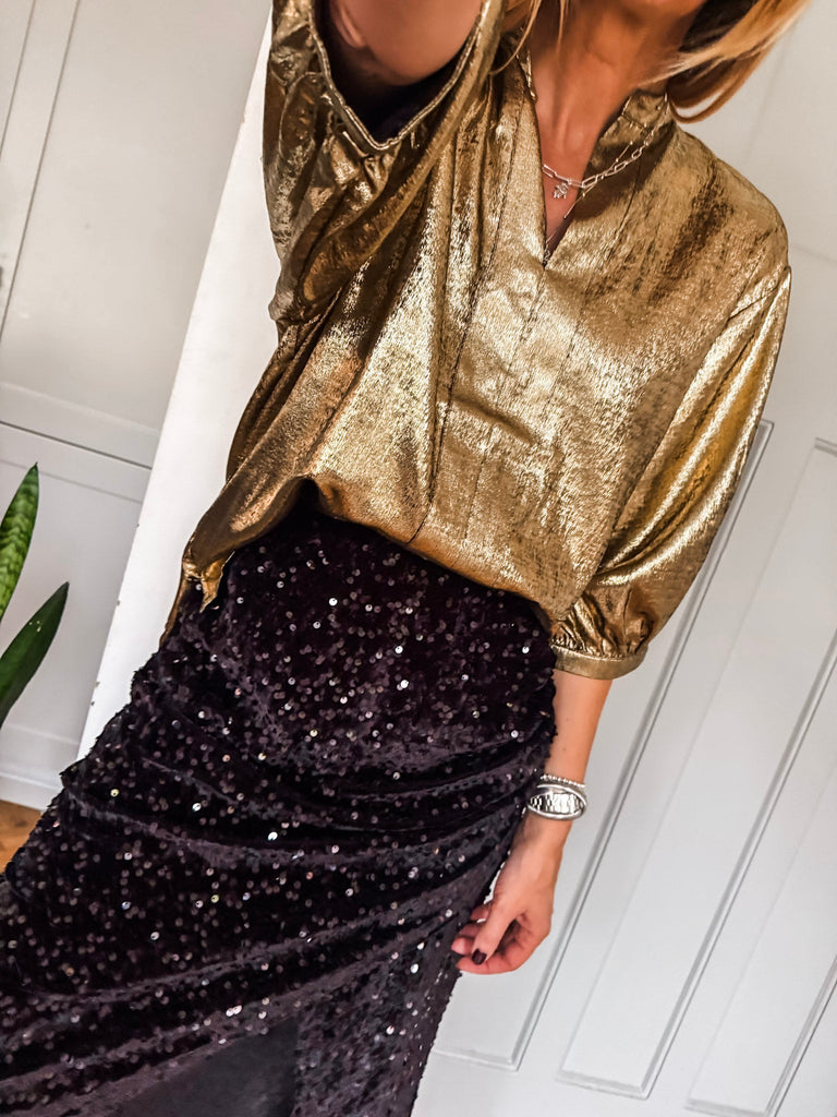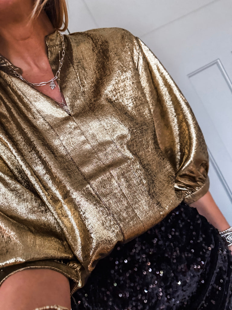 Shine from day to night in this effortlessly chic metallic blouse from Soaked in Luxury. With its flattering V-neckline, three-quarter sleeves, and elegant shimmer, it’s made to catch the light and compliments alike. Perfect for elevating any look with a touch of modern sophistication.