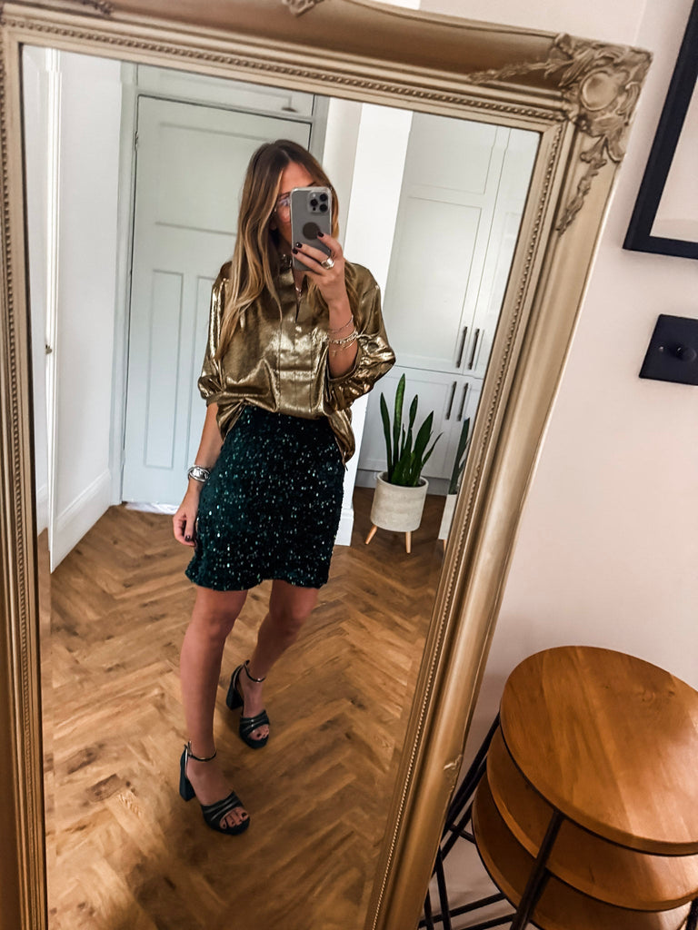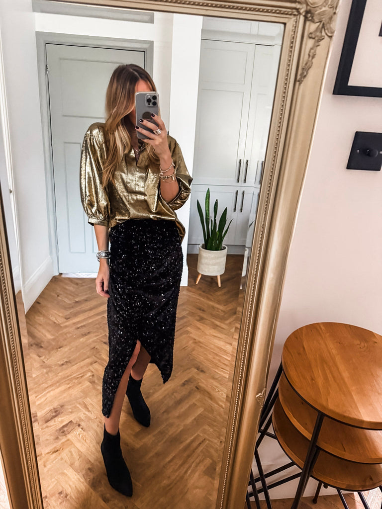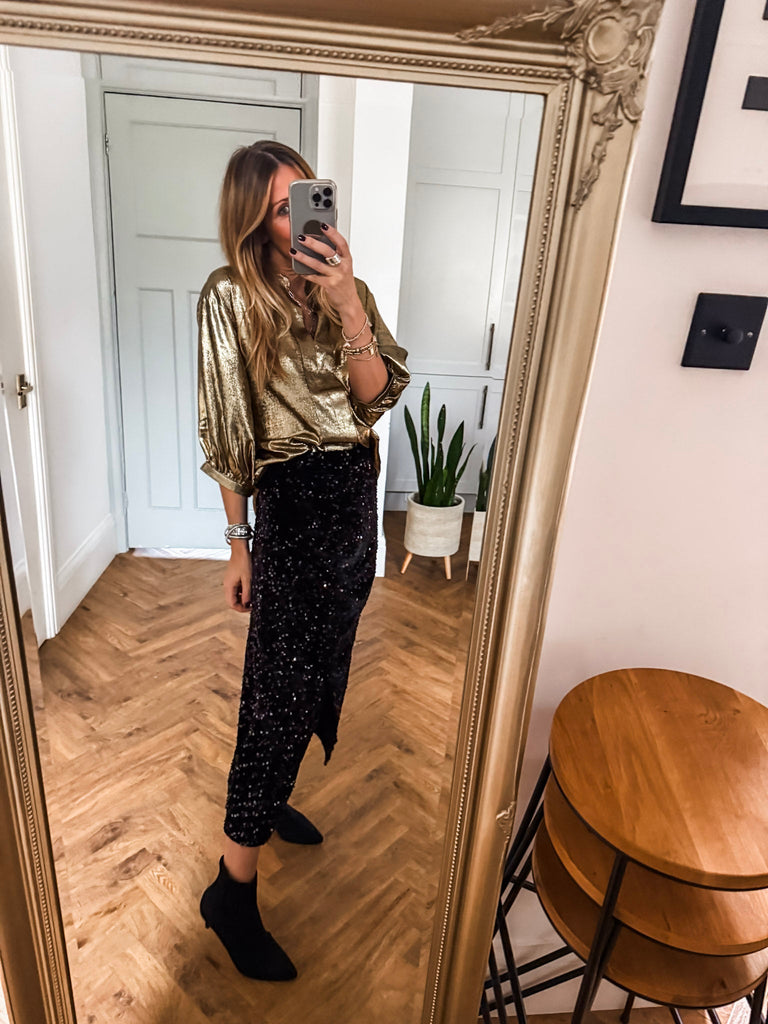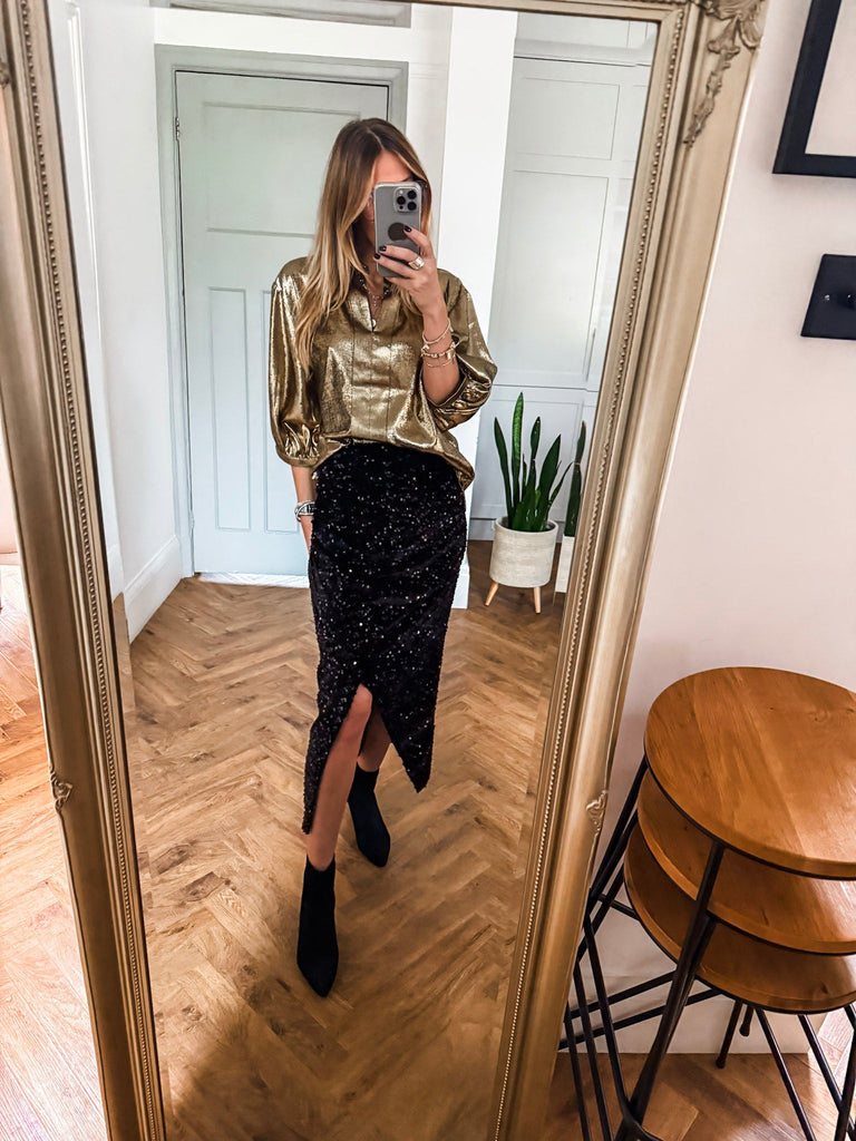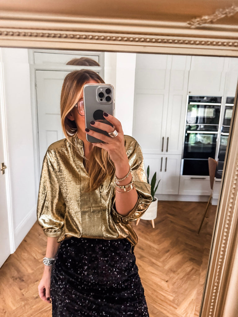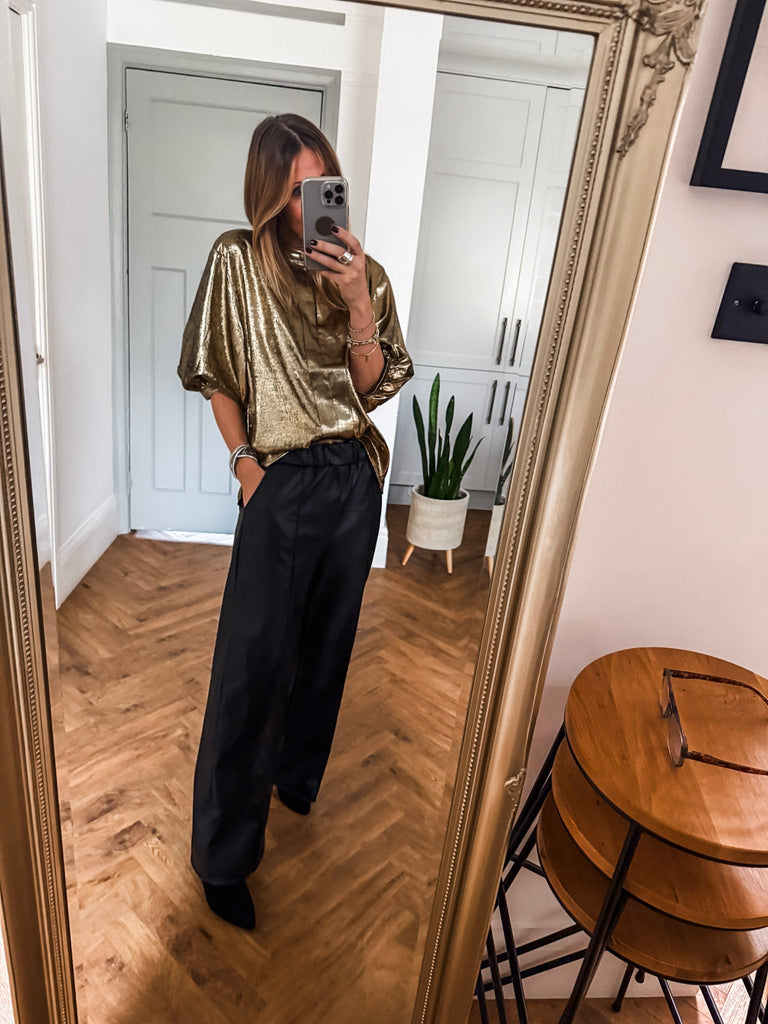 Shine from day to night in this effortlessly chic metallic blouse from Soaked in Luxury. With its flattering V-neckline, three-quarter sleeves, and elegant shimmer, it’s made to catch the light and compliments alike. Perfect for elevating any look with a touch of modern sophistication.